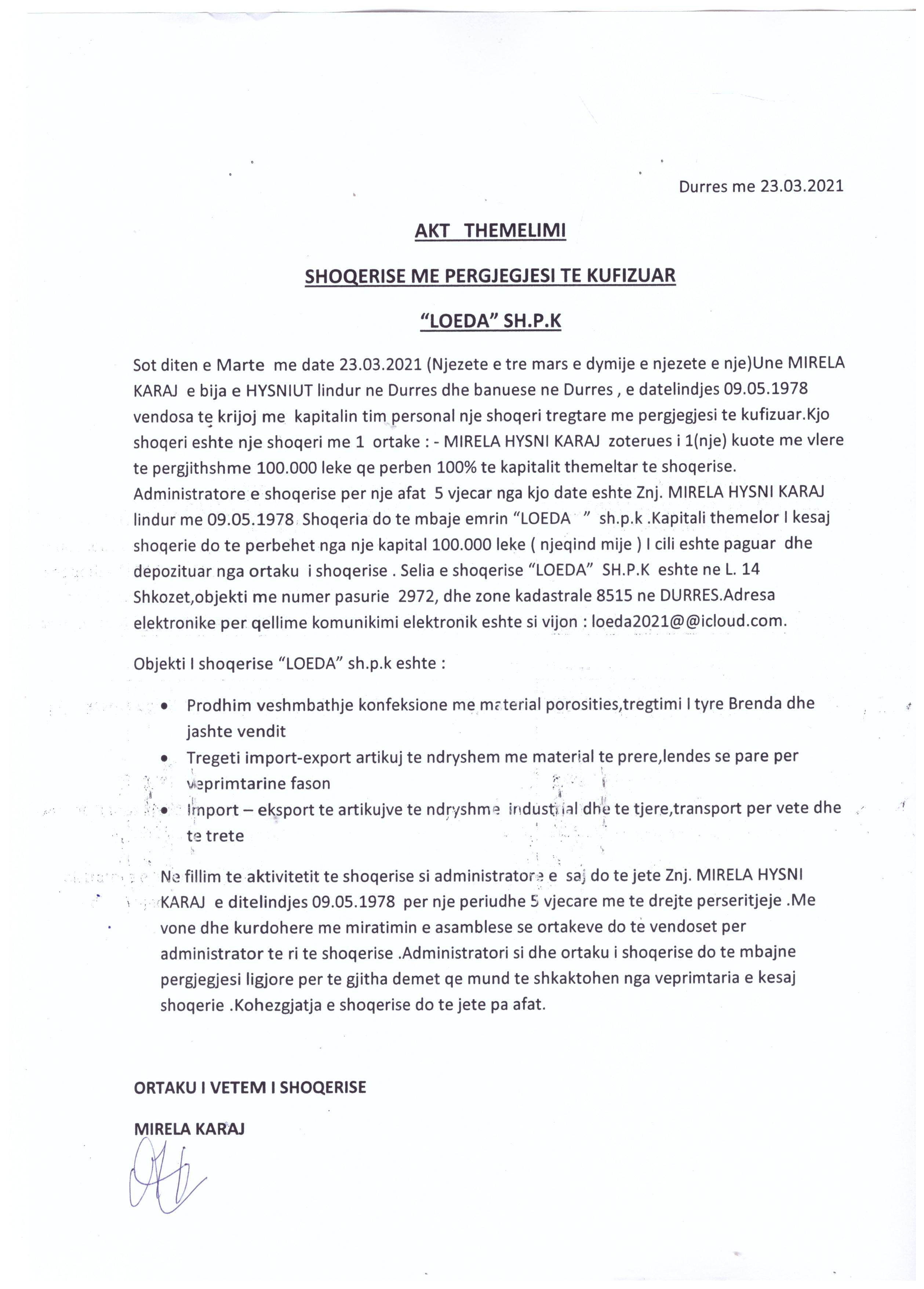 → Ekstrakt Historik i Regjistrit Tregtar, date 27.10.2021 → Akt themelimi, date 23.03.2021 → Statuti i shoqerise, date 23.03.2021 |