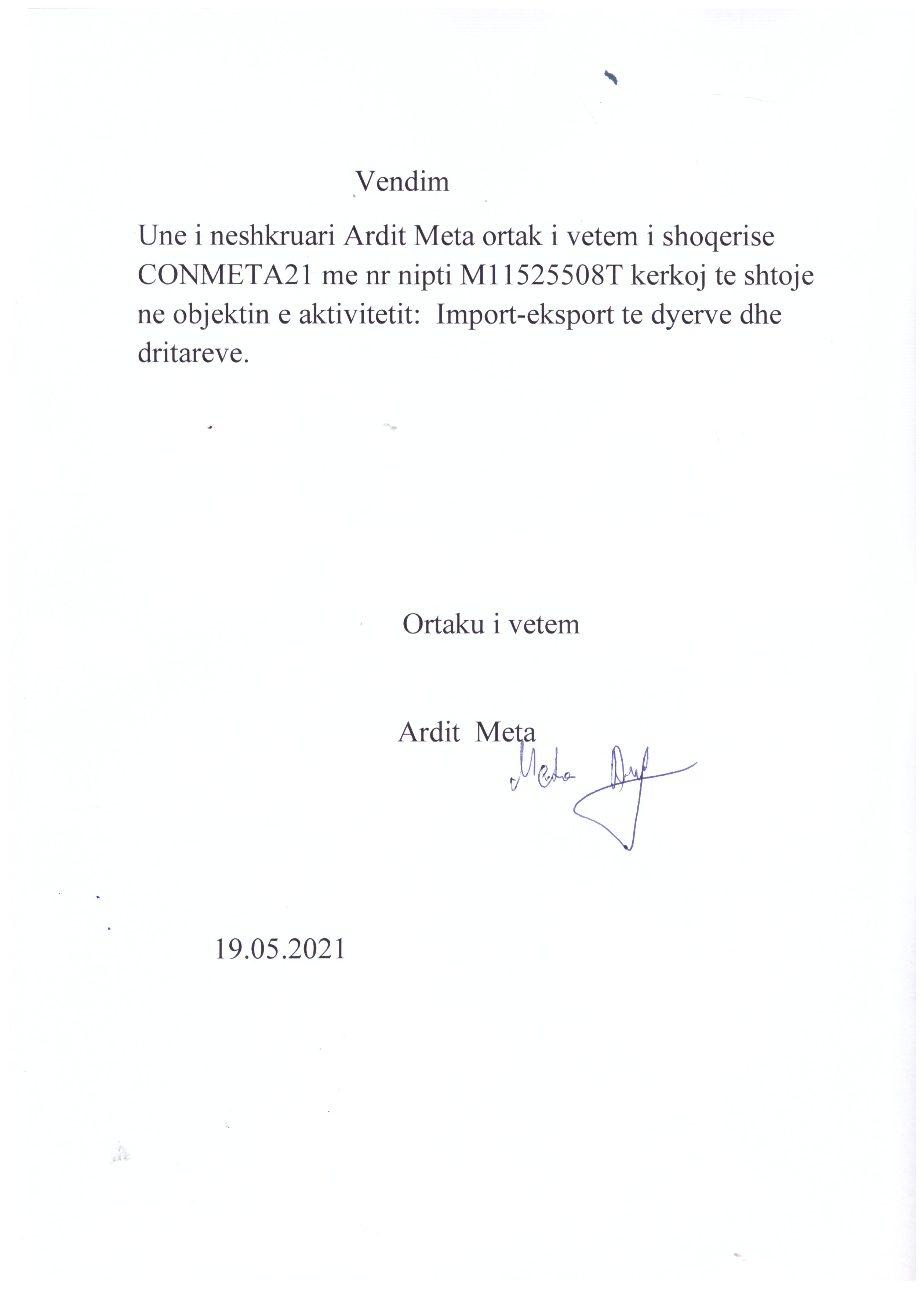 → Ekstrakt Historik i Regjistrit Tregtar, date 28.10.2021 → Akt-themelimi, date 24.03.2021 → Statuti i shoqerise, date 24.03.2021 → Vendimi i Ortakut te Vetem, date 05.05.2021 → Vendimi i asamblese se Ortakeve, date 19.05.2021 |