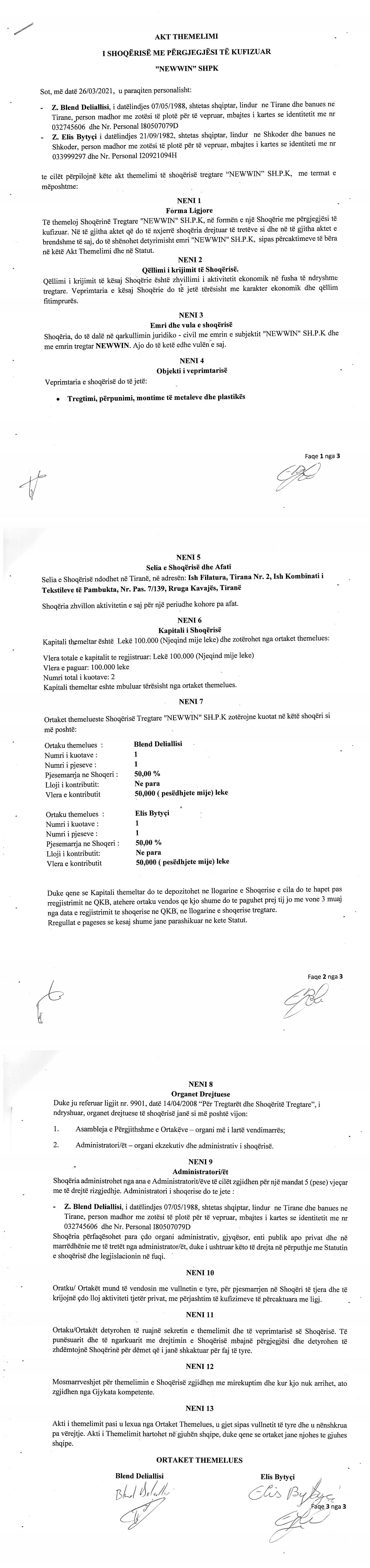 → Ekstrakt Historik i Regjistrit Tregtar, date 1.11.2021 → Akt themelimi, date 26.03.2021 → Statuti i shoqerise, date 26.03.2021 |