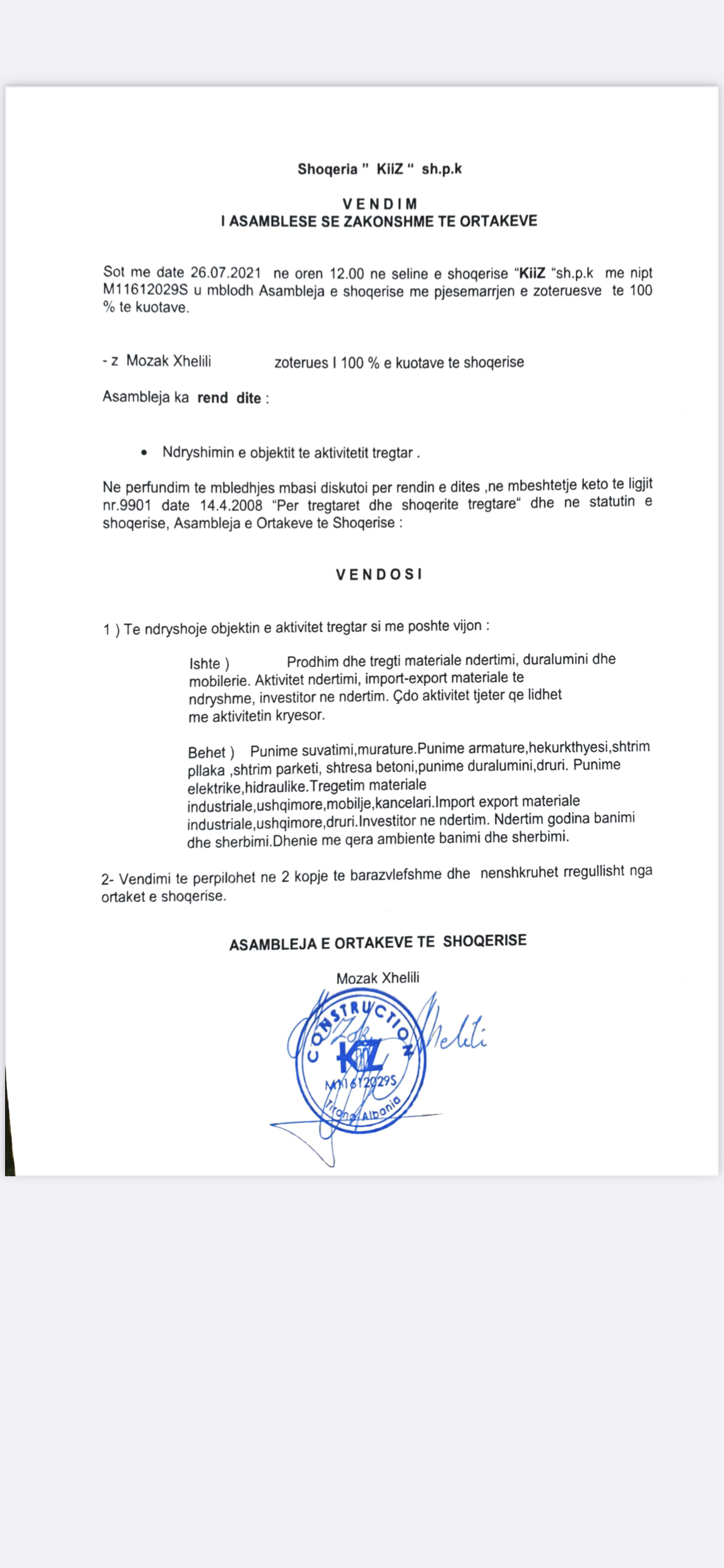 → Ekstrakt Historik i Regjistrit Tregtar, date 7.11.2021 → Vendimi i Ortakut te Vetem, date 26.7.2021 → Statuti i shoqerise, date 9.4.2021 → Akt themelimi, date 9.4.2021 |