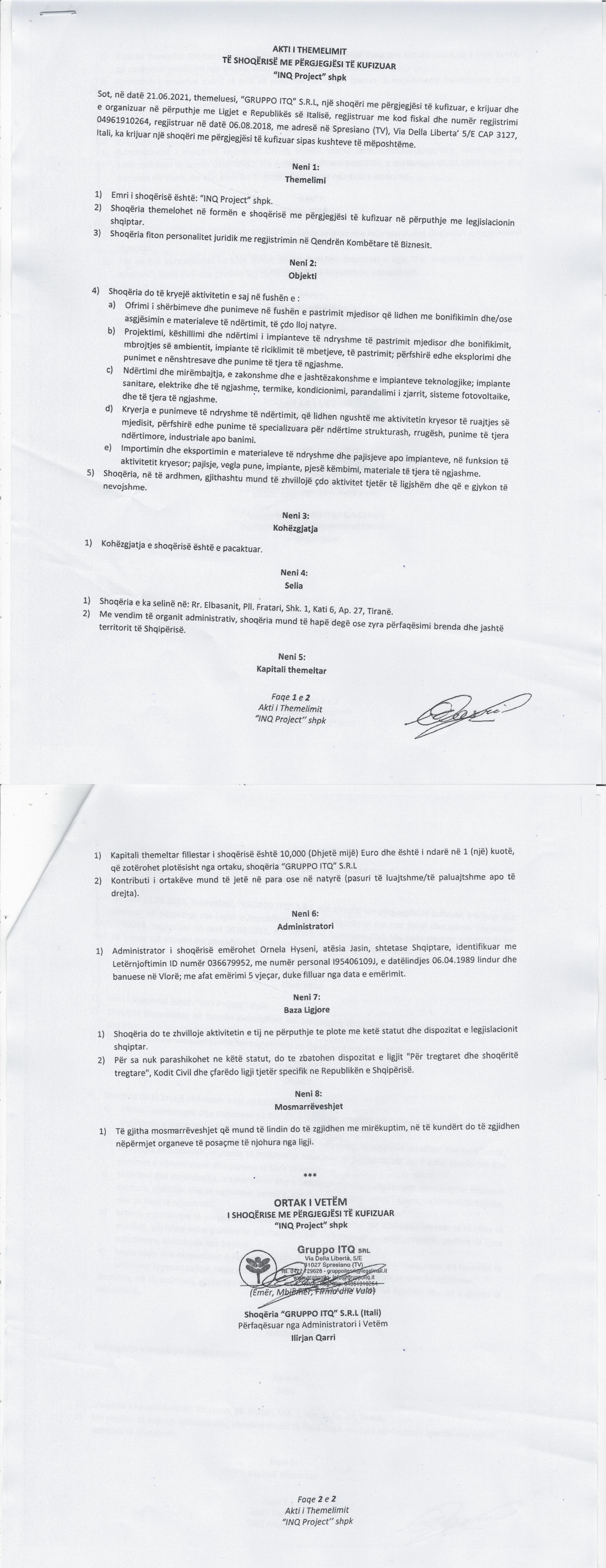 → Ekstrakt Historik i Regjistrit Tregtar, date 07.02.2022 → Akt themelimi, date 21.06.2021 → Statuti i shoqerise, date 21.06.2021 |