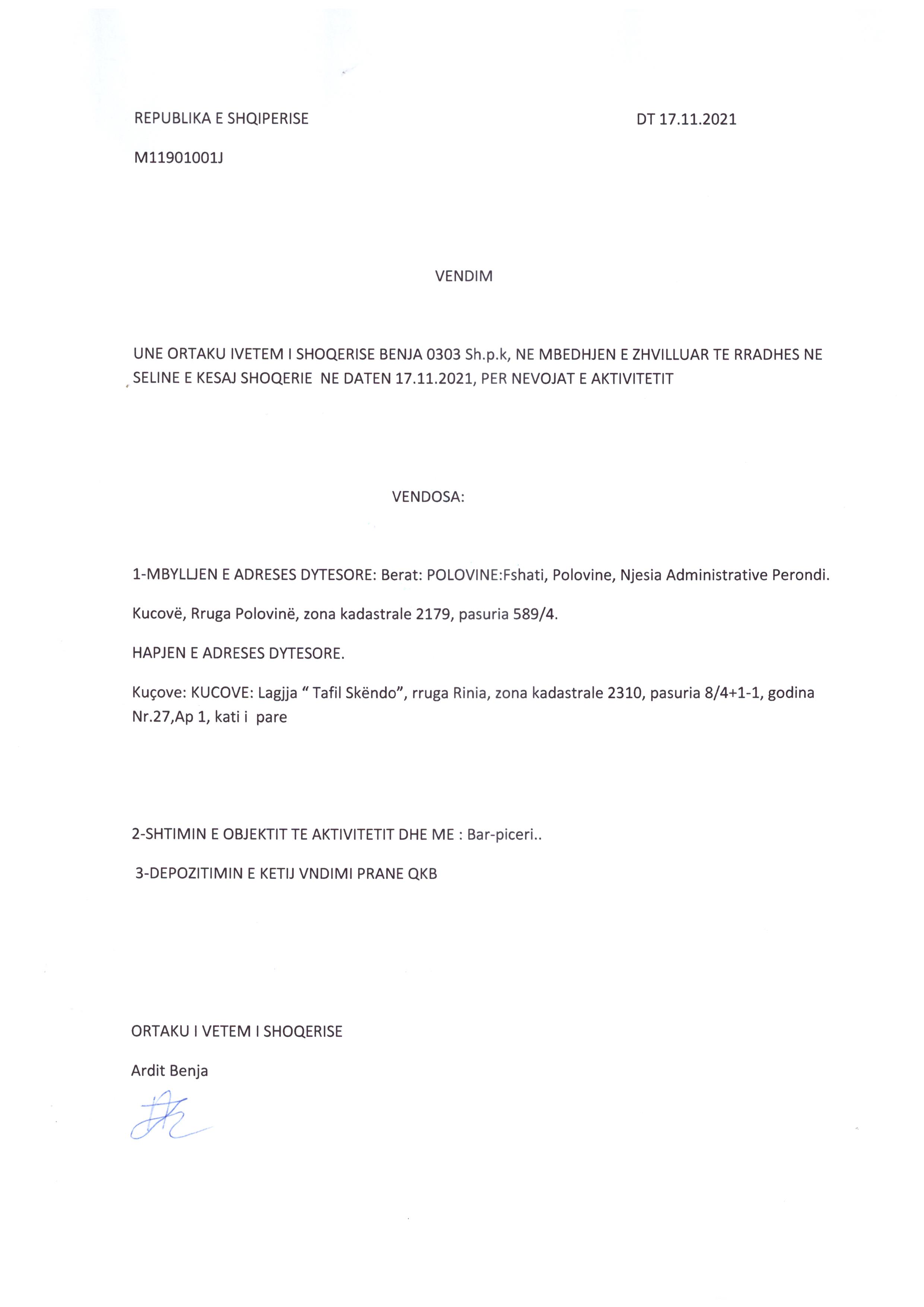 → Ekstrakt Historik i Regjistrit Tregtar, date 08.02.2022 → Statuti i shoqerise, date 28.06.2021 → Akt themelimi, date 28.06.2021 → Vendimi i ortakut te vetem, date 17.11.2021 |