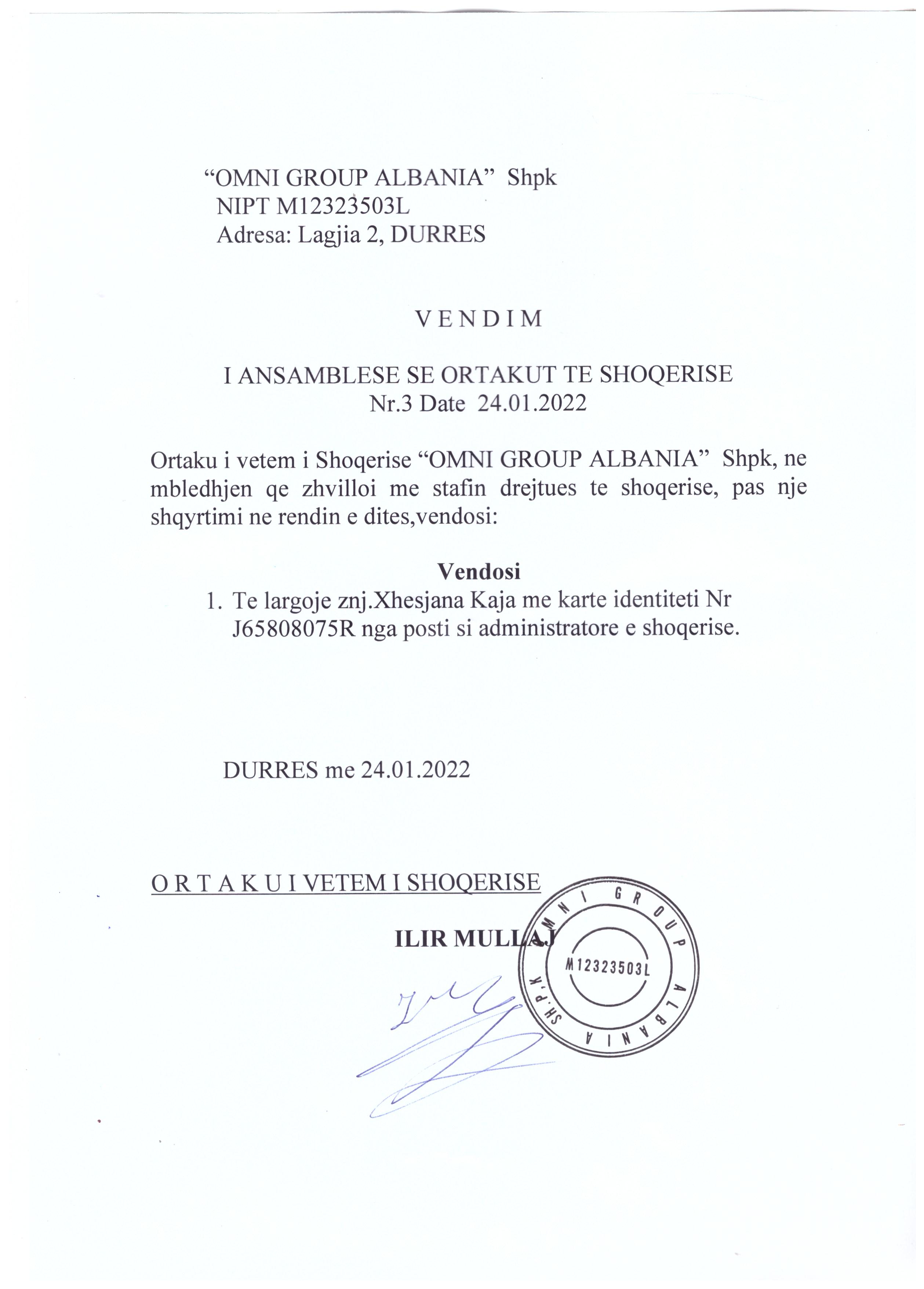 → Ekstrakti Historik i Regjistrit Tregtar date 15.03.2022 → Akt themelimi i Shoqerise → Vendimi i asamblese se pergjithshme date 05.01.2022 → Vendimi i asamblese se pergjithshme date 24.01.2022 |