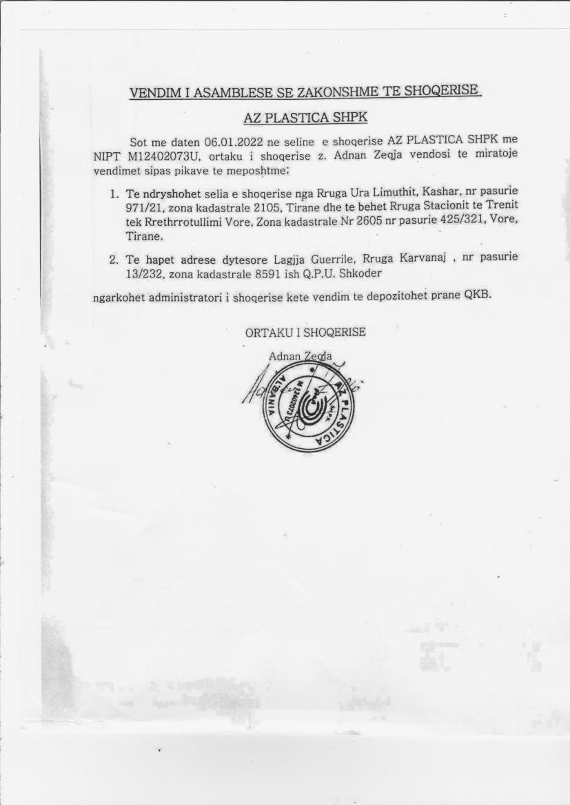 → Ekstrakti Historik i Regjistrit Tregtar date 16.03.2022 → Statuti i Shoqerise → Vendimi i asamblese se pergjithshme date 06.01.2022 |