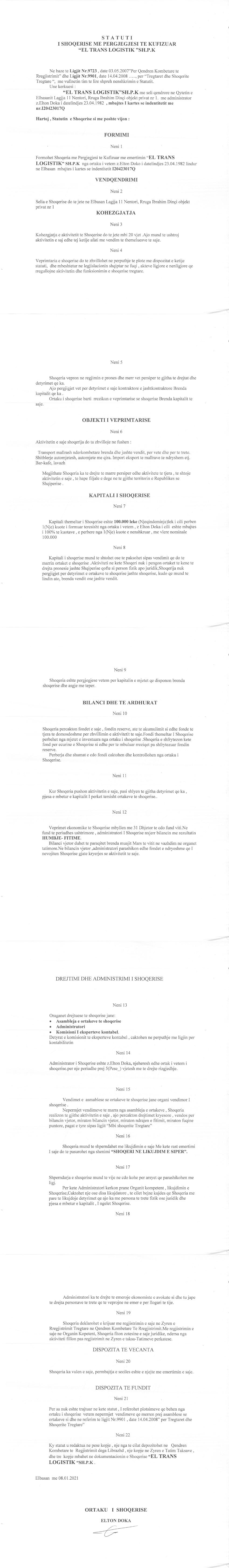 → Ekstrakt Historik i Regjistrit Tregtar, date 16.06.2022 → Statuti i Shoqerise |
