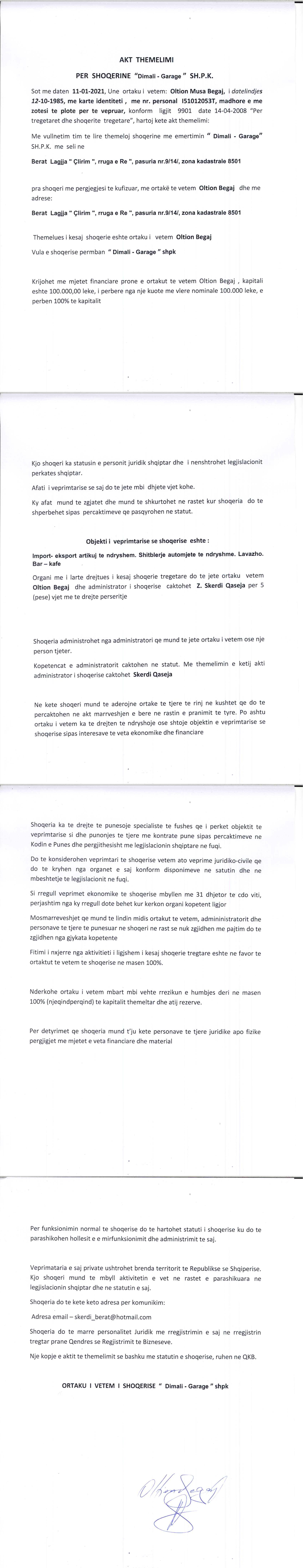 → Ekstrakt Historik i Regjistrit Tregtar, date 01.09.2021 → Akti i themelimit, date 11.01.2021 |