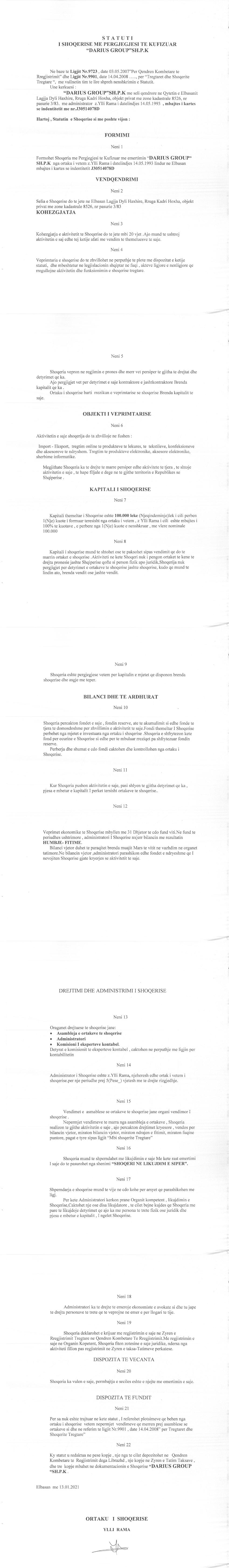 → Ekstrakti Historik i Regjistrit Tregtar, date 2/9/2021 → Statuti i shoqerise, date 13/1/2021 |