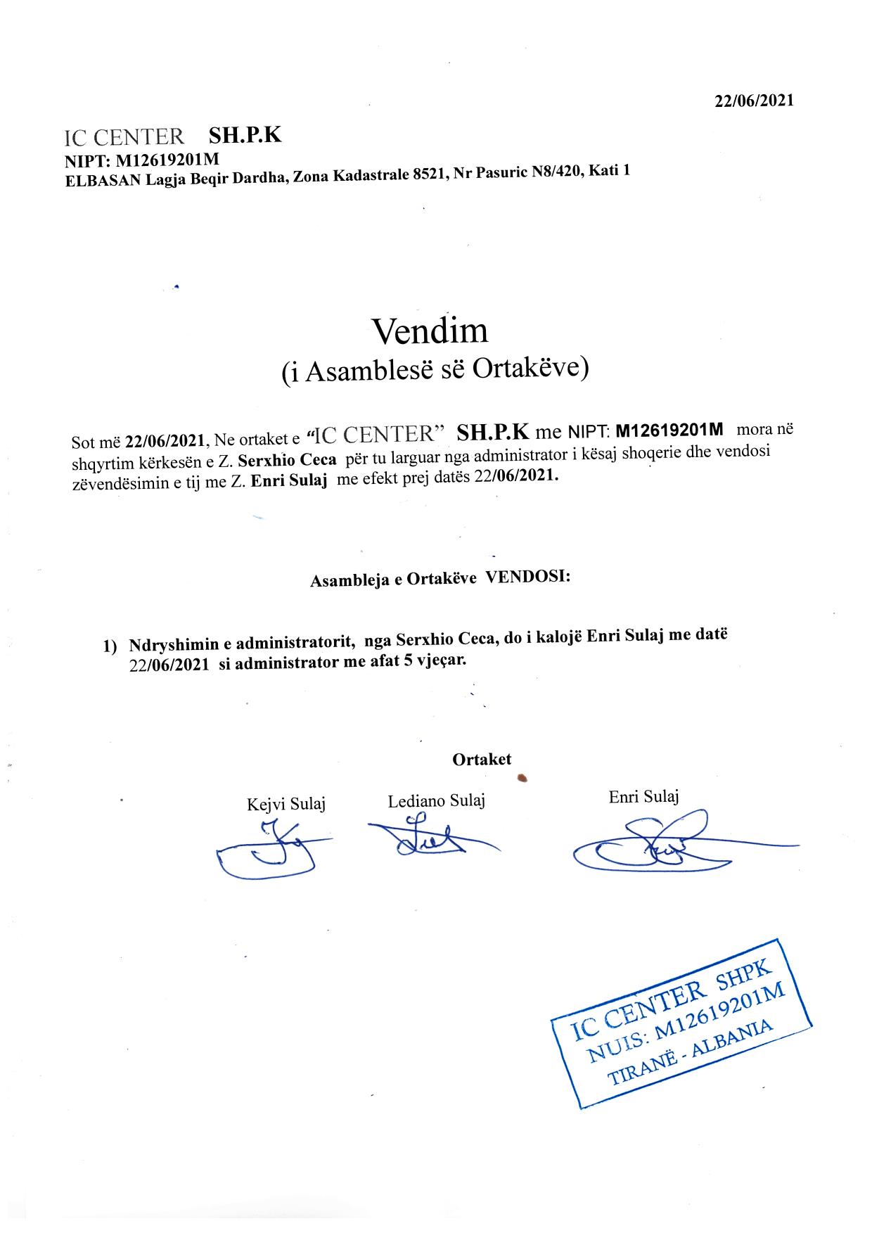 → Ekstrakt Historik i Regjistrit Tregtar, date 1.10.2021 → Akti themelimit, date 01.02.2021 → Statuti i shoqerise, date 01.02.2021 → Vendimi i asamblese, date 22.06.2021 |