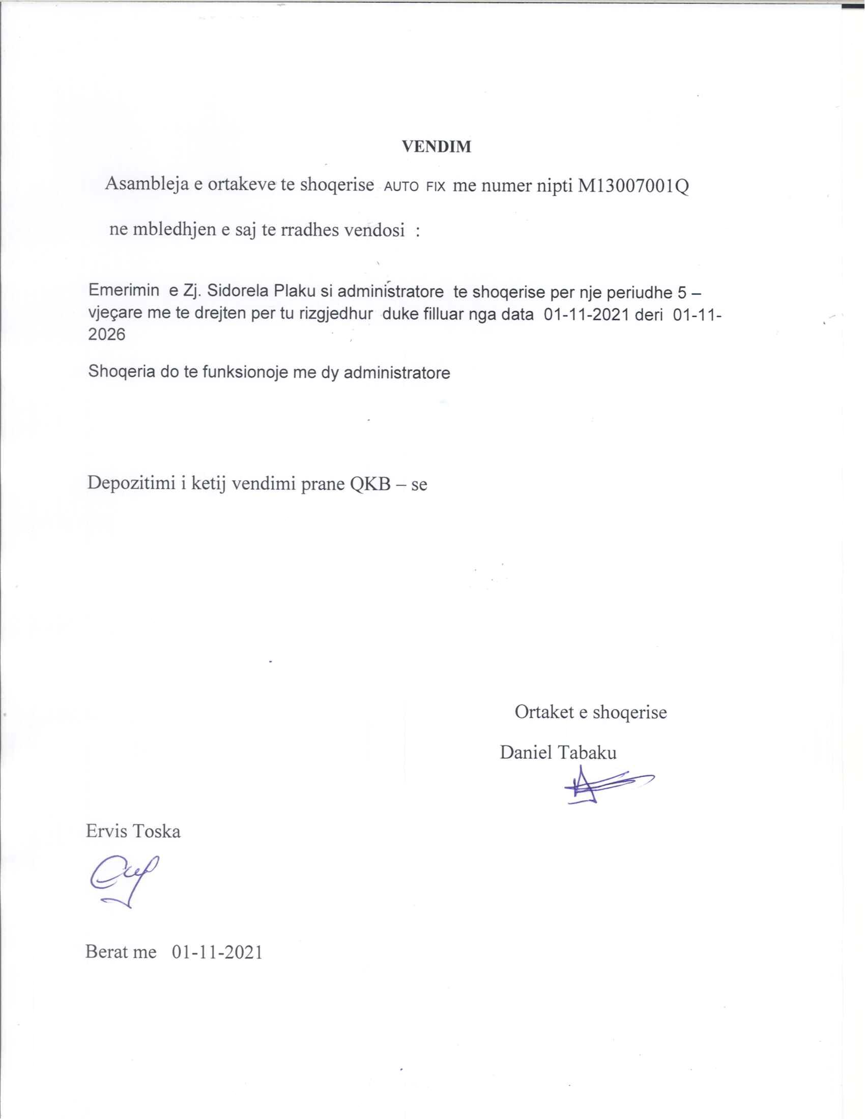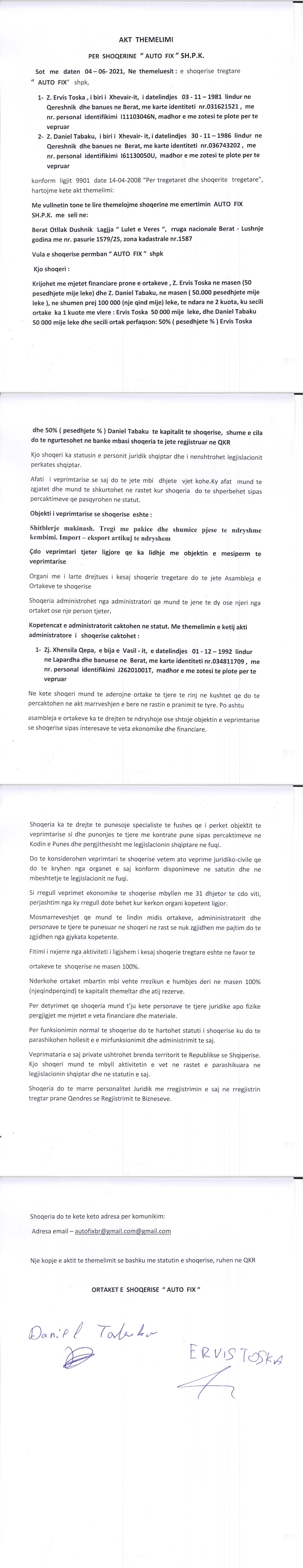 → Ekstrakt Historik i Regjistrit Tregtar, date 29.01.2022 → Statuti i shoqerise, date 04.06.2021 → Akt themelimi, date 04.06.2021 → Vendimi i asamblese se pergjithshme, date 01.11.2021 |