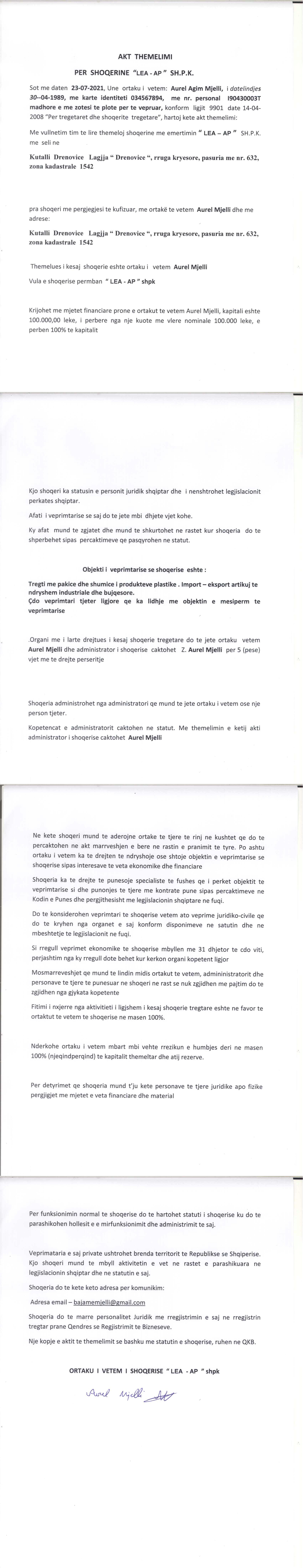 → Ekstrakt Historik i Regjistrit Tregtar, date 16.02.2022 → Akt themelimi, date 23.07.2021 → Statuti i shoqerise, date 23.07.2021 |