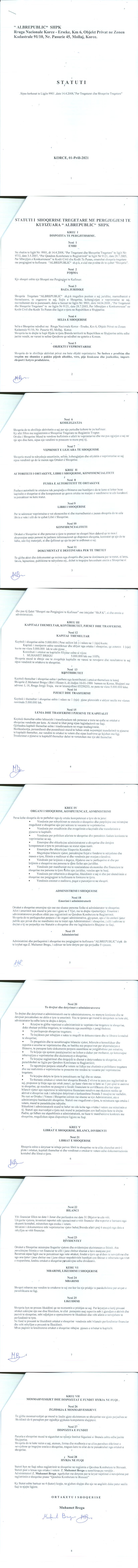 → Ekstrakt Historik i Regjjistrit Tregtar, date 2.11.2021 → Statuti i shoqerise,date 01.04.2021 |
