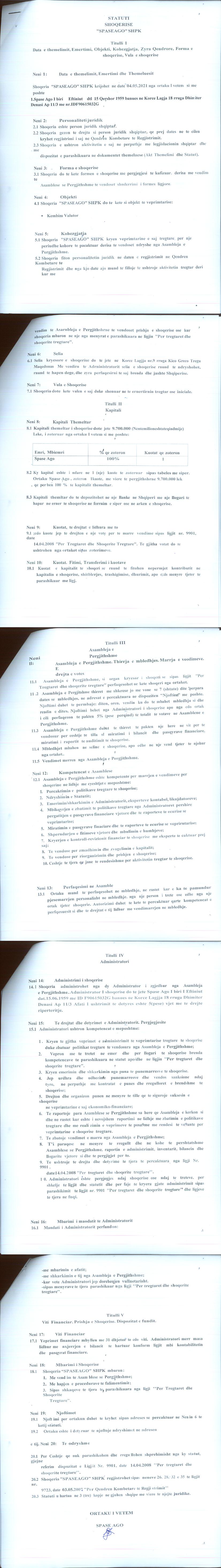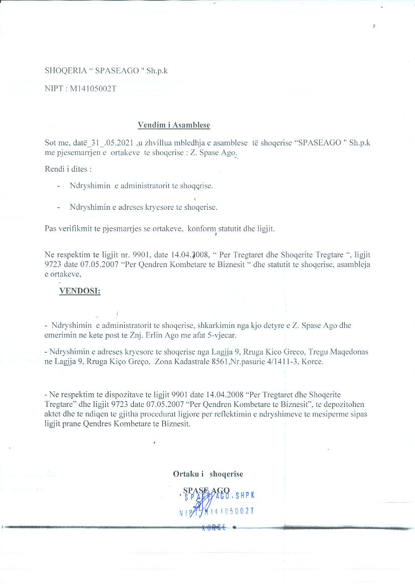 → Ekstrakt Historik i Regjistrit Tregtar, date 24.01.2022 → Statuti i shoqerise, date 04.05.2021 → Vendimi i ortakut te vetem, date 31.05.2021 |