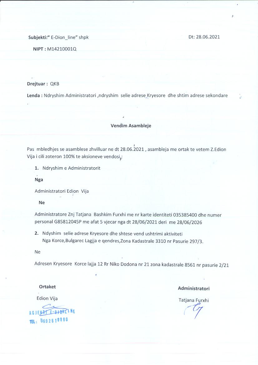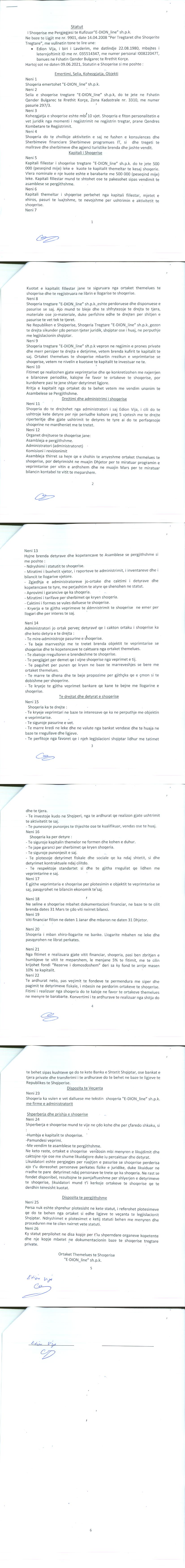 → Ekstrakt Historik i Regjistrit Tregtar, date 01.02.2022 → Statuti i shoqerise, date 09.06.2021 → Vendimi i ortakut te vetem, date 28.06.2021 |