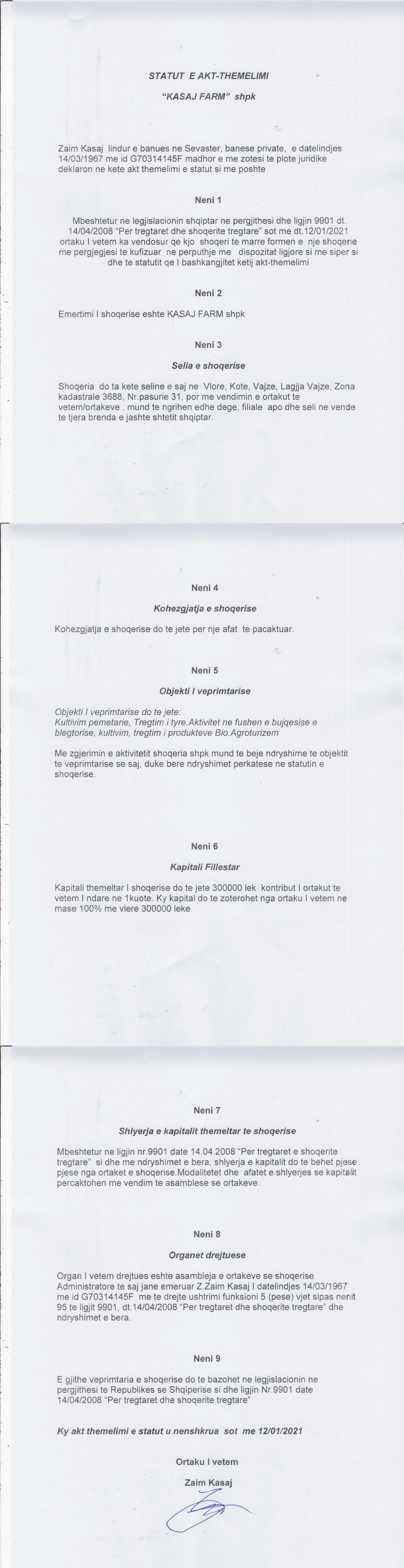| Objekti i Veprimtarisë: | Kultivim pemetarie, tregtim i tyre. Aktivitet ne fushen e bujqesise e blegtorise, kultivim i produkteve bio. Agroturizem |