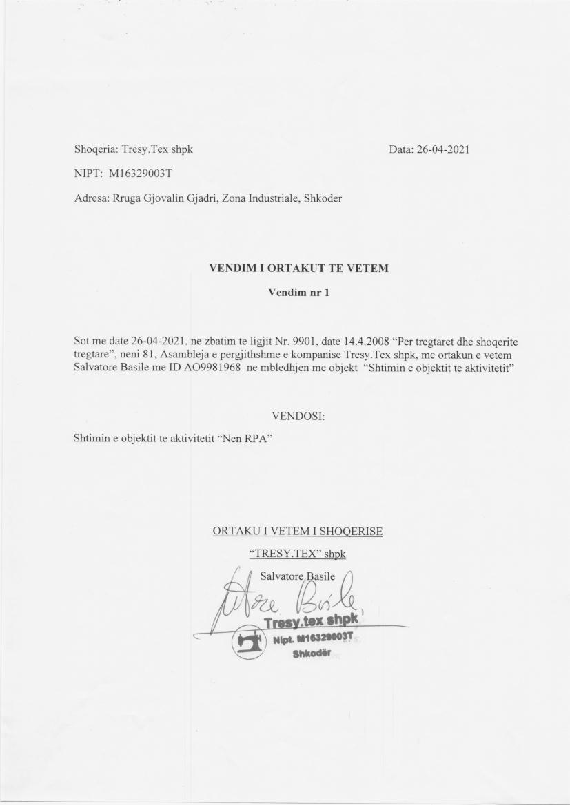 → Ekstrakt Historik i Regjistrit Tregtar, date 15/9/2021 → Vendimi i ortakut te vetem, date 26.04.2021 → Vendim i ortakut te vetem, date 24.08.2021 → Akt themelimi dhe statuti i shoqerise, date 20.01.2021 |