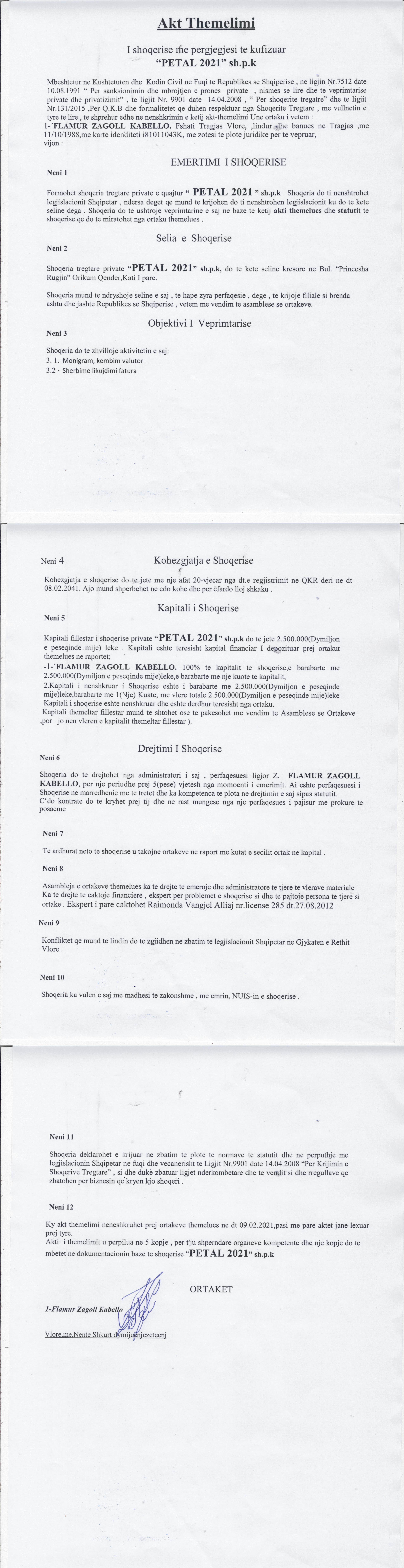 → Ekstrakt Historik i Regjistrit Tregtar, date 29/9/2021 → Statuti i shoqerise, date 09.02.2021 → Akt themelimi , date 09.02.2021 |