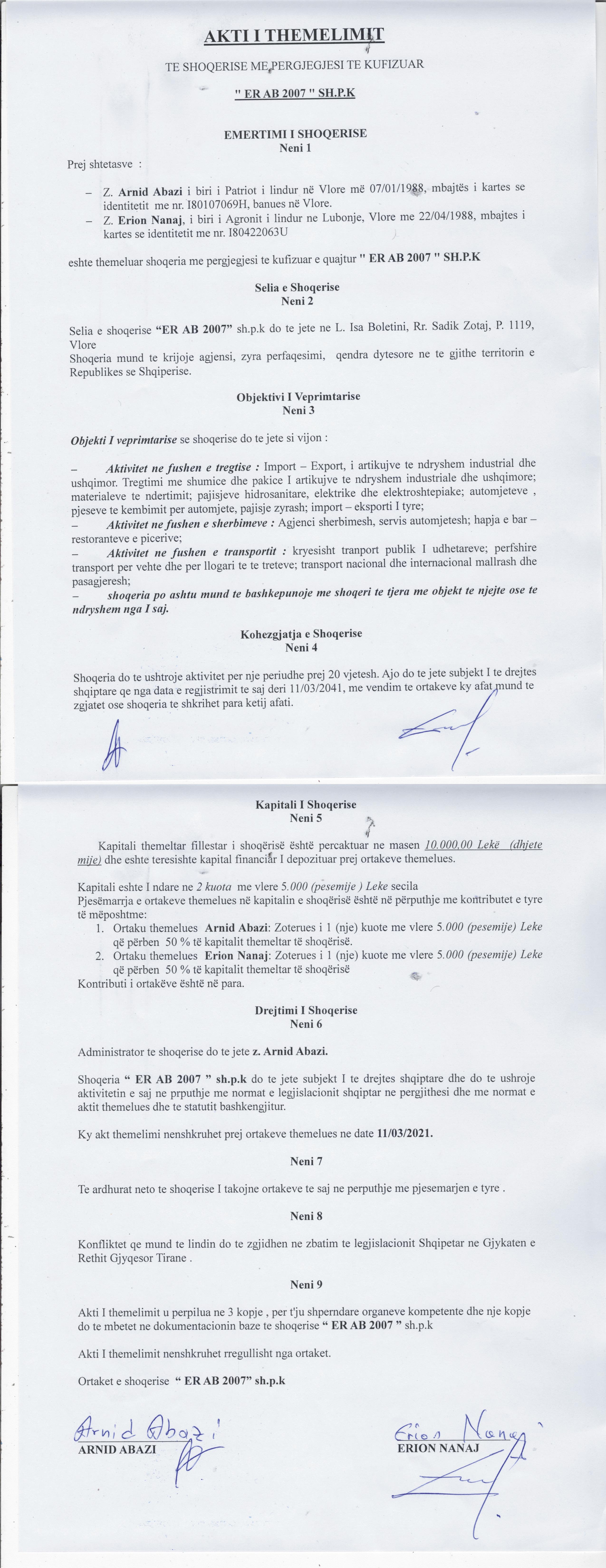→ Ekstrakt Historik i Regjistrit Tregtar, date 20.10.2021 → Statusi i shoqerise, date 11.03.2021 → Akt themelimi, date 11.03.2021 |