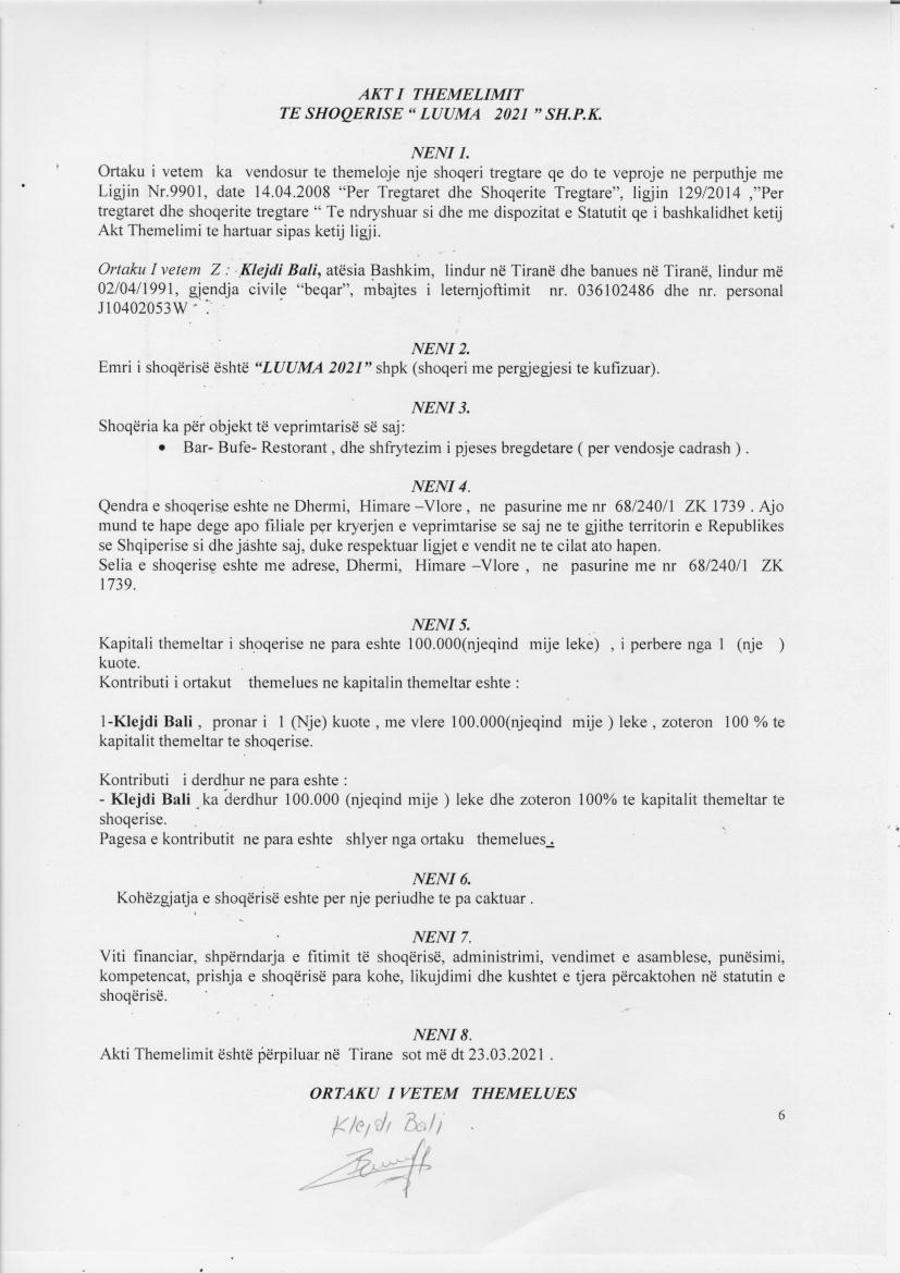 → Ekstrakt Historik i Regjistrit Tregtar, date 27.10.2021 → Akt themelimi, date 23.03.2021 → Statuti i shoqerise, date 23.03.2021 |