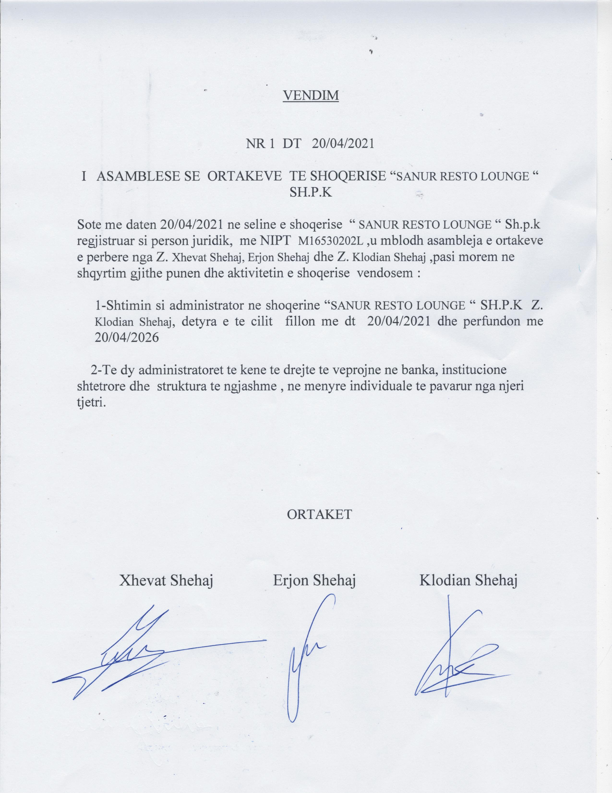 → Ekstrakt Historik i Regjistrit Tregtar, date 1.11.2021 → Statuti i shoqerise, date 18.03.2021 → Akt themelimi, date 18.03.2021 → Vendimi i Ortakeve te shoqerise, date 20.04.2021 |