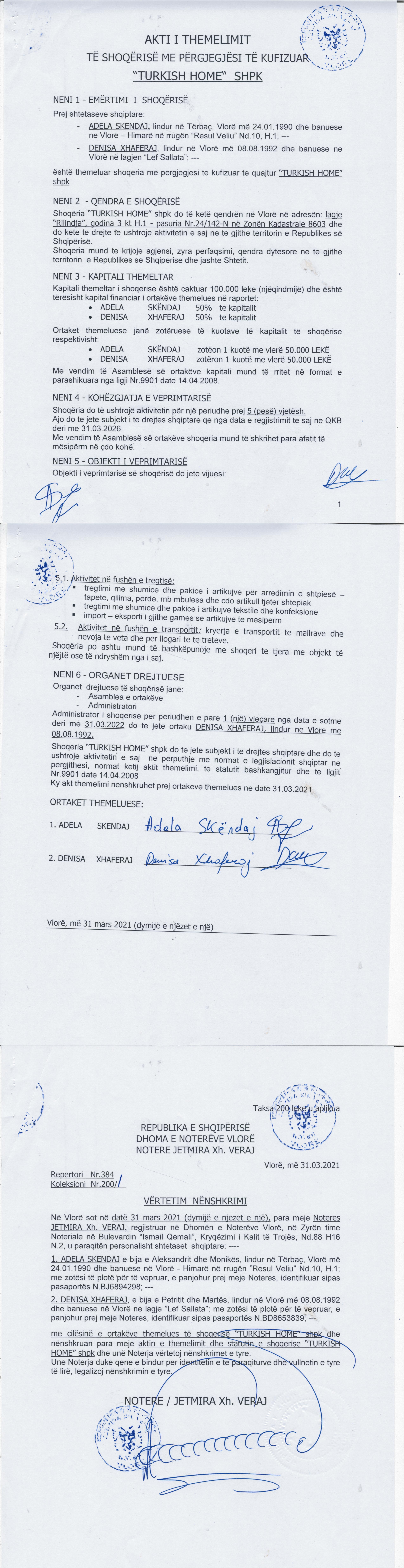 → Ekstrakt Historik i Regjistrit Tregtar, date 2.11.2021 → Akt themelimi, date 31.3.2021 → Statut i shoqerise,date 31.3.2021 |