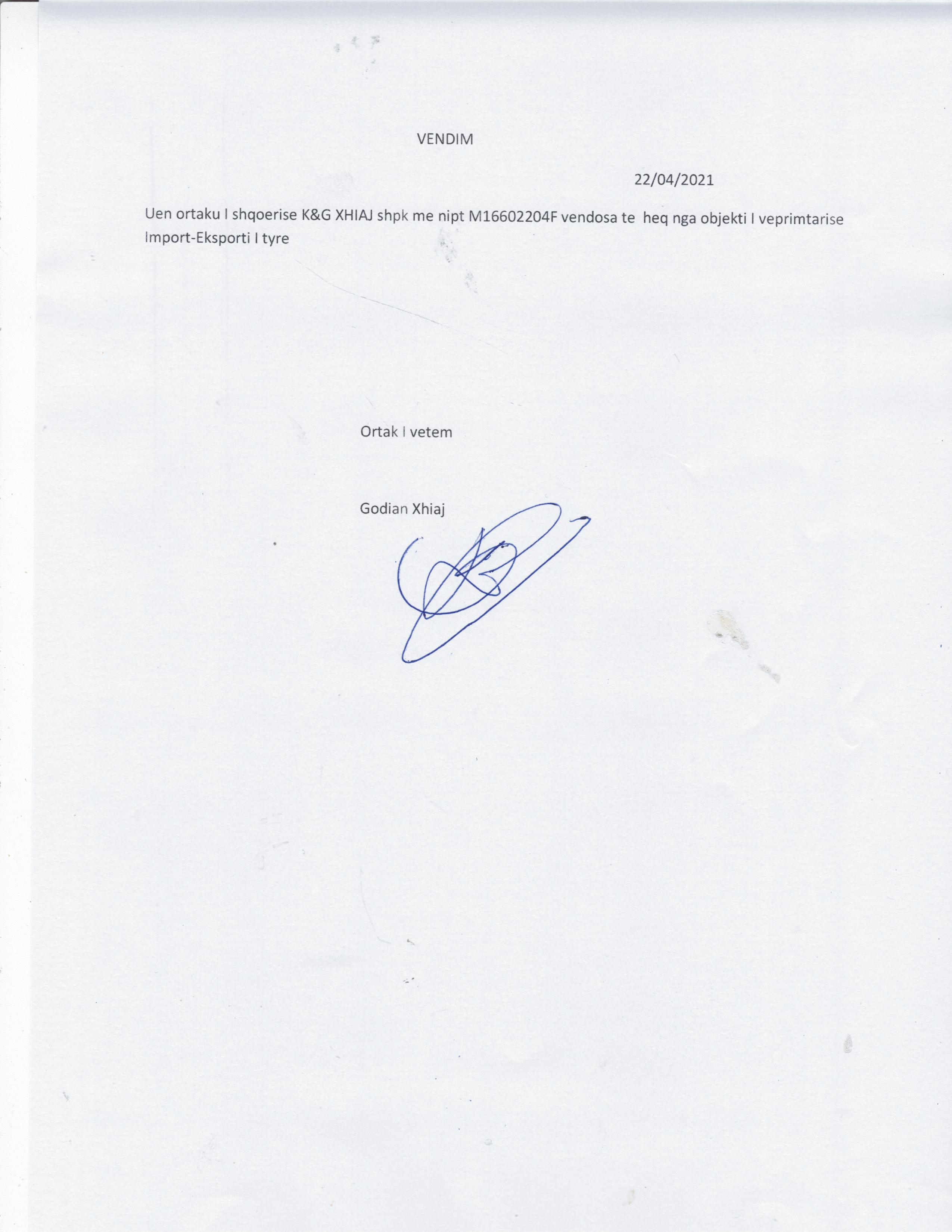 → Ekstrakt Historik i Regjistrit Tregtar, date 2.11.2021 → Statuti i sshoqerise, date 01.4.2021 → Vendimi i Ortakut te vetem, date 22.04.2021 |