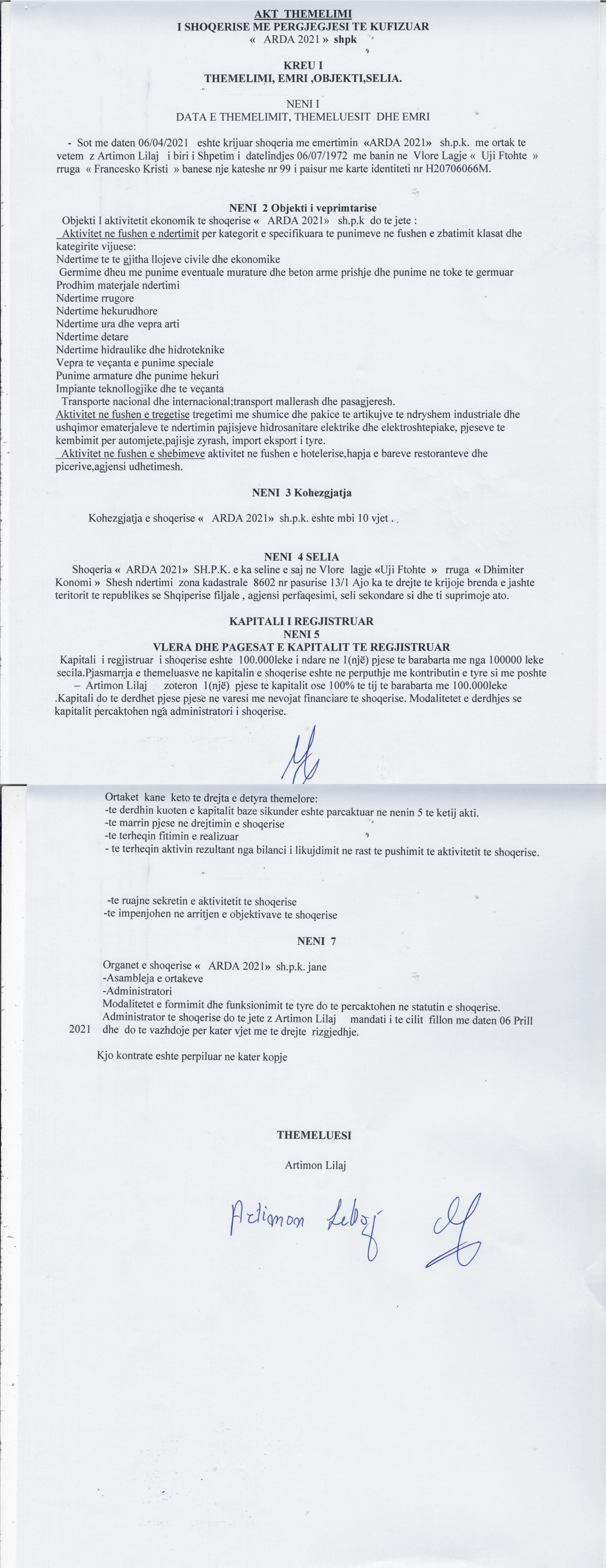 → Ekstrakt Historik i Regjistrit Tregtar, date 9/11/2021 → Statuti i shoqerise, date 06.04.2021 → Akt themelimi, date 06.04.2021 |
