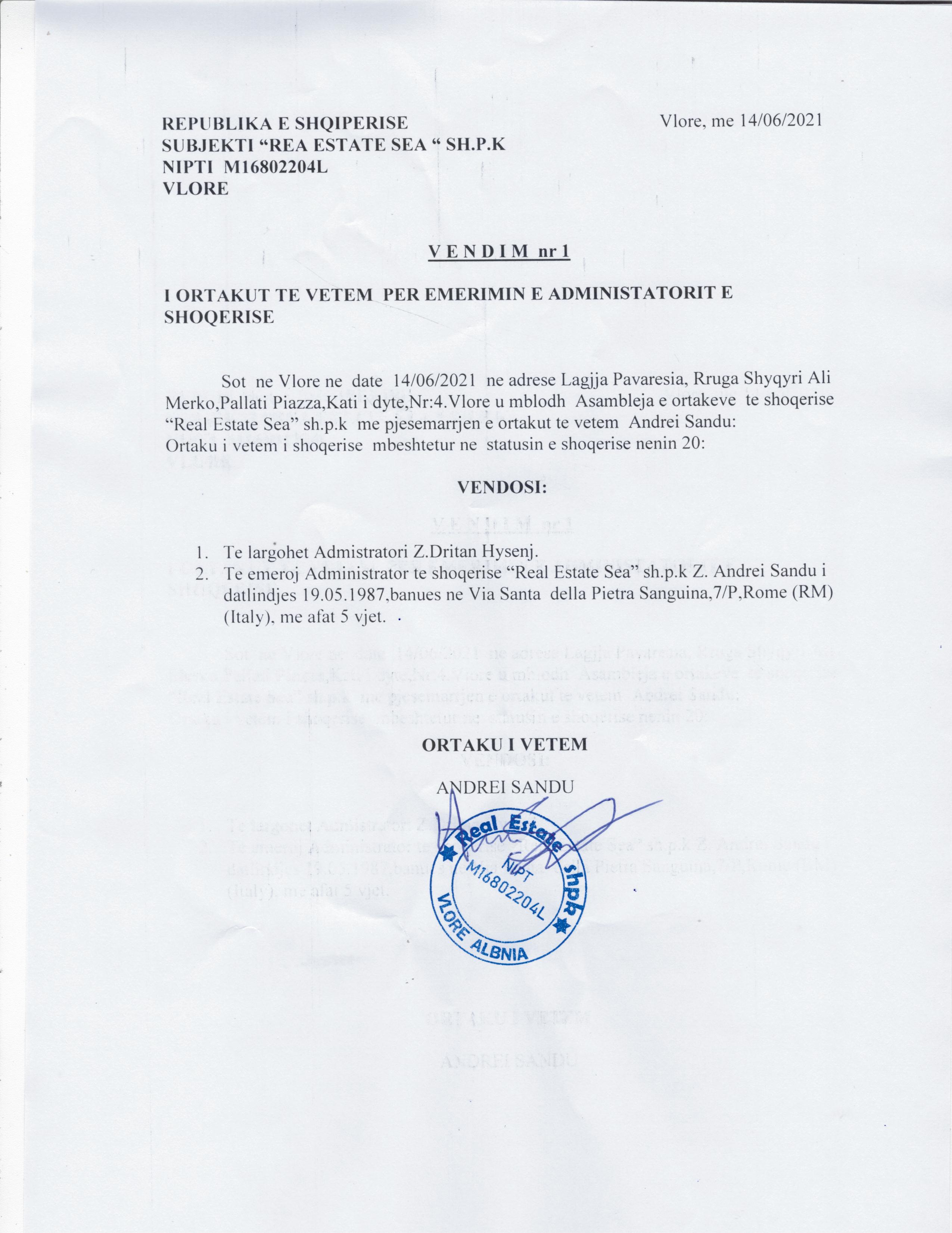 → Ekstrakt Historik i Regjistrit Tregtar, date 28.01.2022 → Statuti i shoqerise, date 28.05.2021 → Vendimi i ortakut te vetem, date 14.06.2021 → Kerkese, date 09.07.2021 |