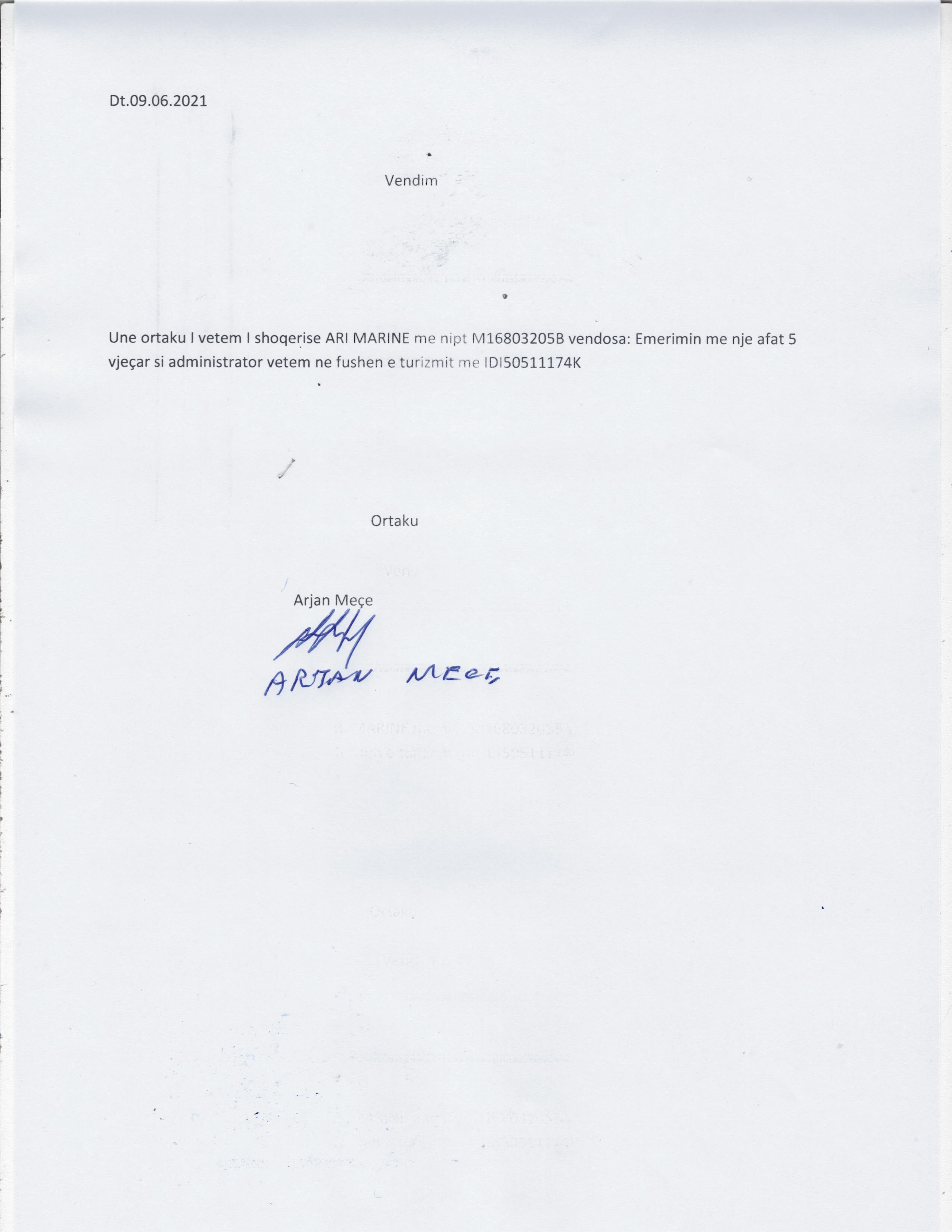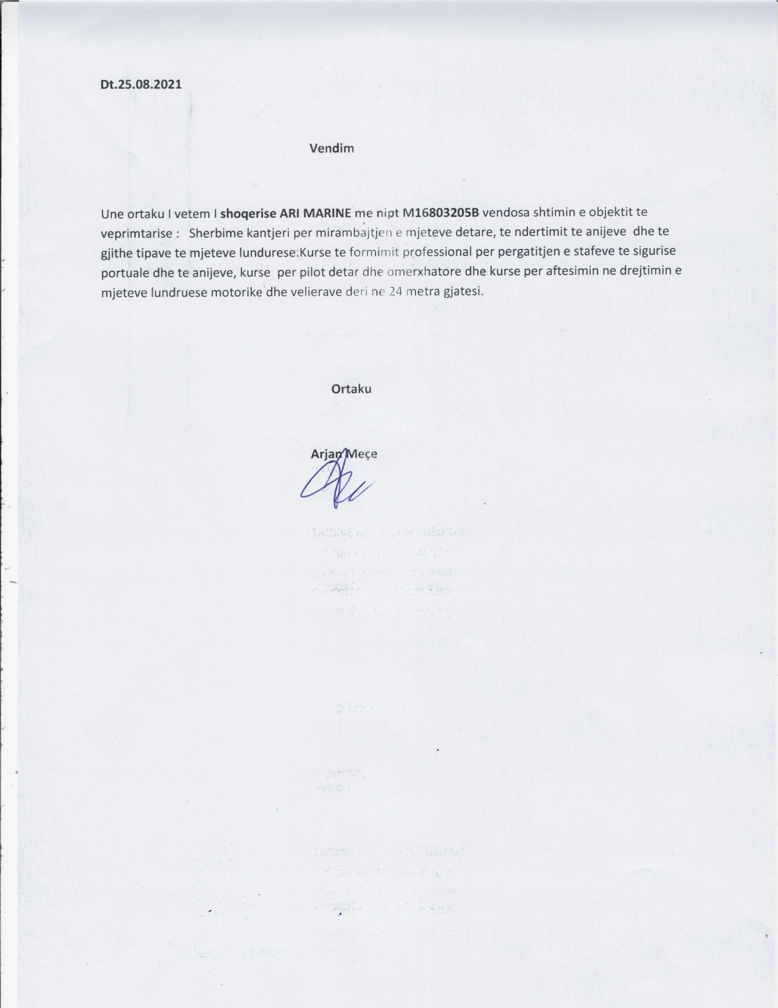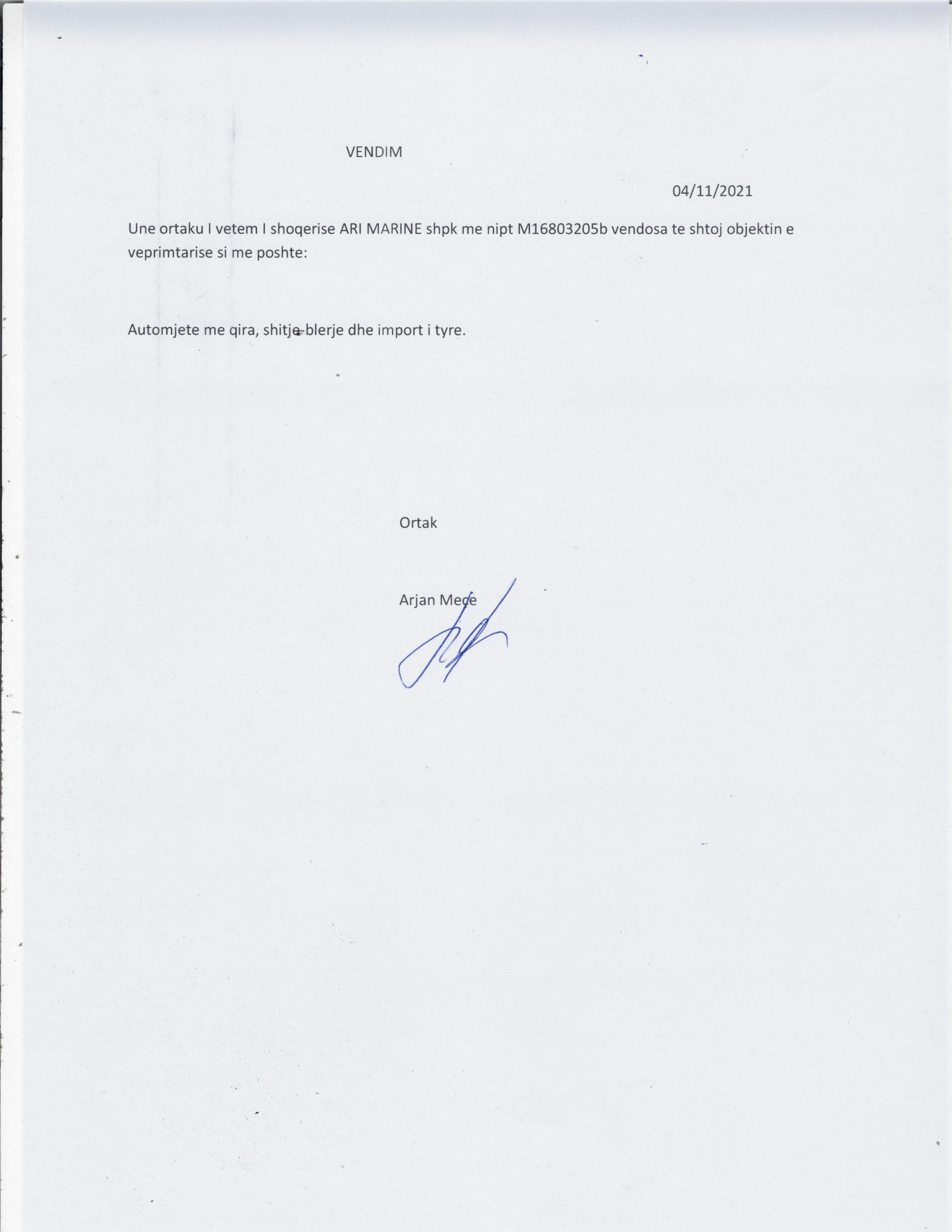 → Ekstrakt Historik I Regjistrit Tregtar, date 28.01.2022 → Vendimi i ortakut te vetem, date 09.06.2021 → Vendimi i ortakut te vetem, date 25.08.2021 → Vendimi i ortakut te vetem, date 04.11.2021 |