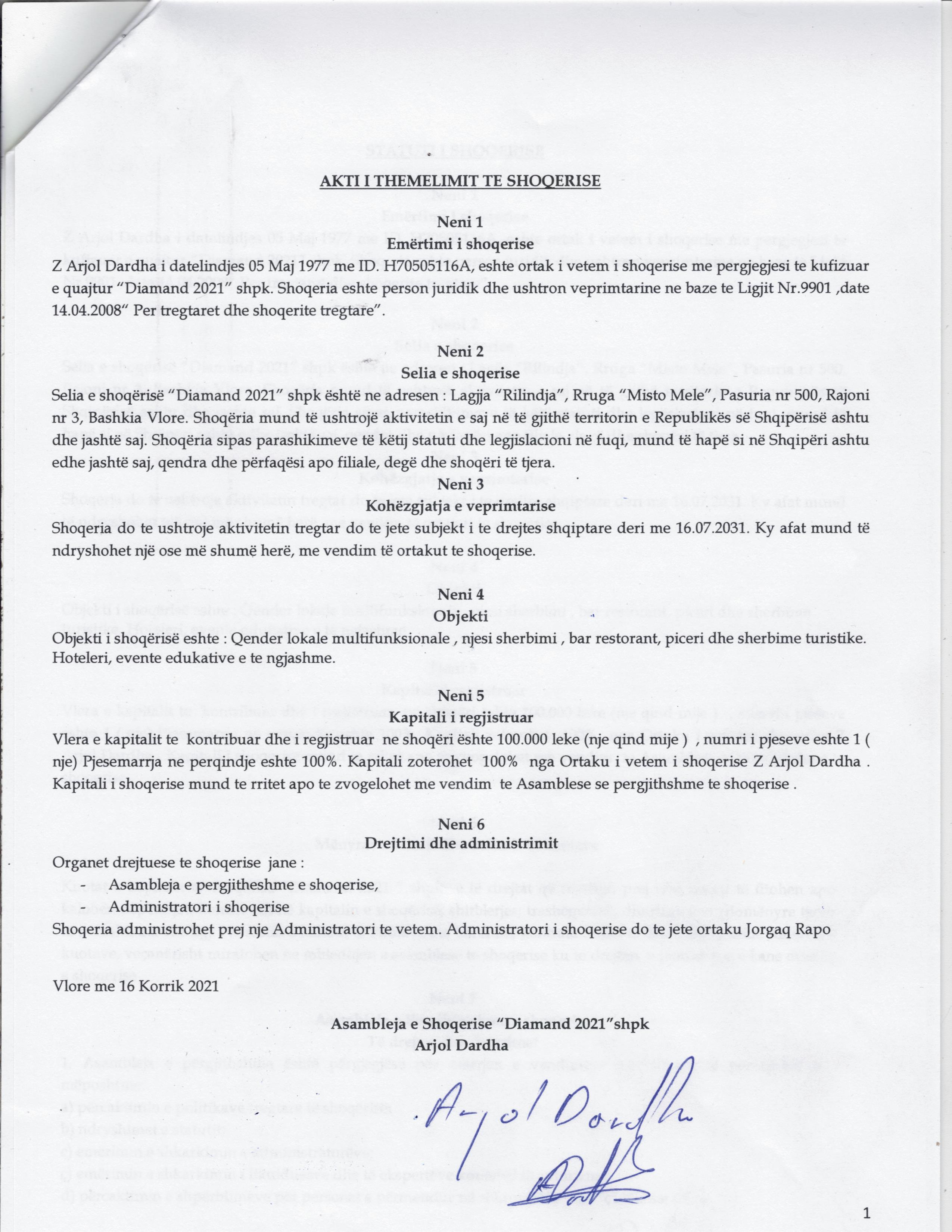 → Ekstrakt Historik i Regjistrit Tregtar, date 16.02.2022 → Akt themelimi, date 16.07.2021 → Statuti i shoqerise, date 16.07.2021 |