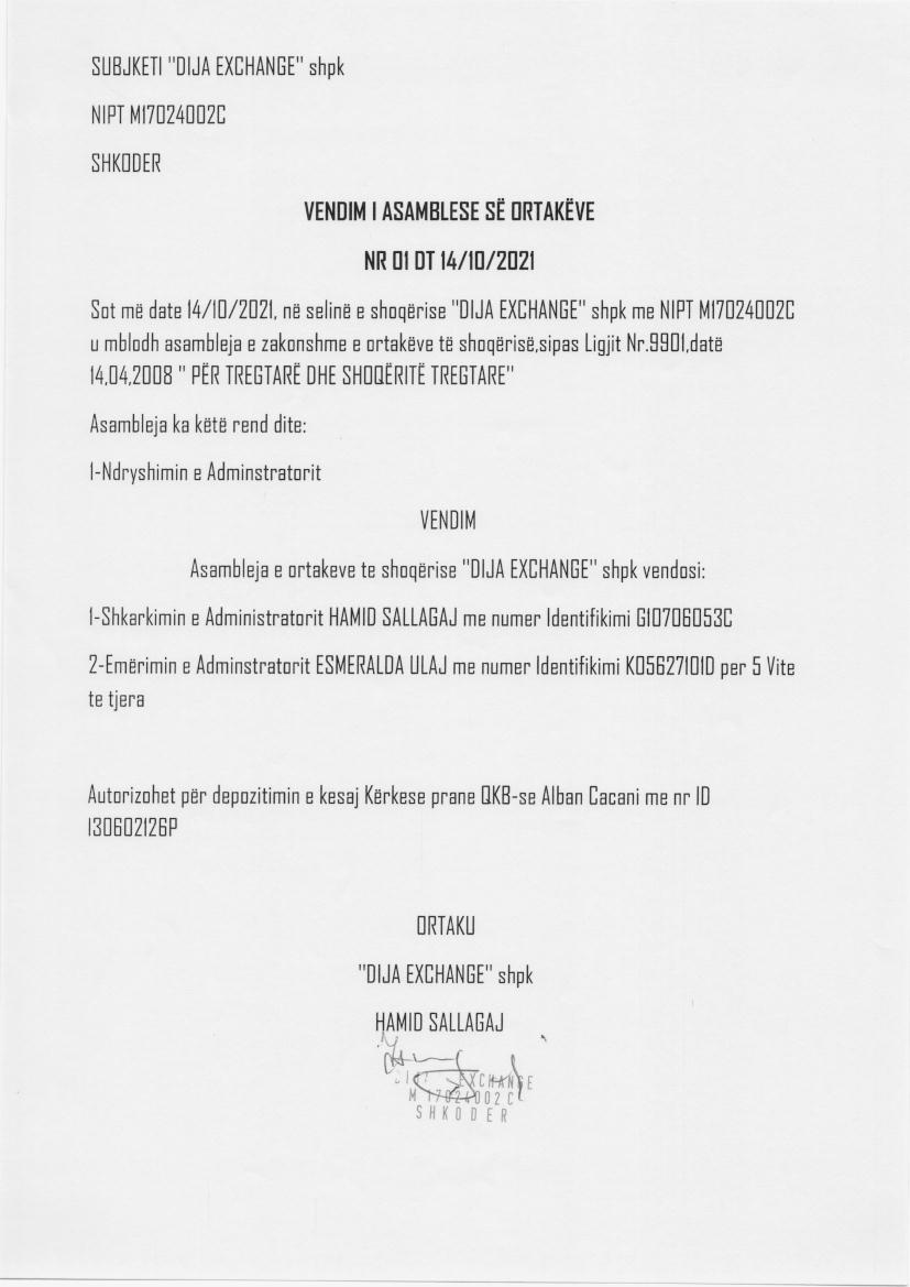 | Emërtime të tjera Tregtare: | DIJA EXCHANGE |