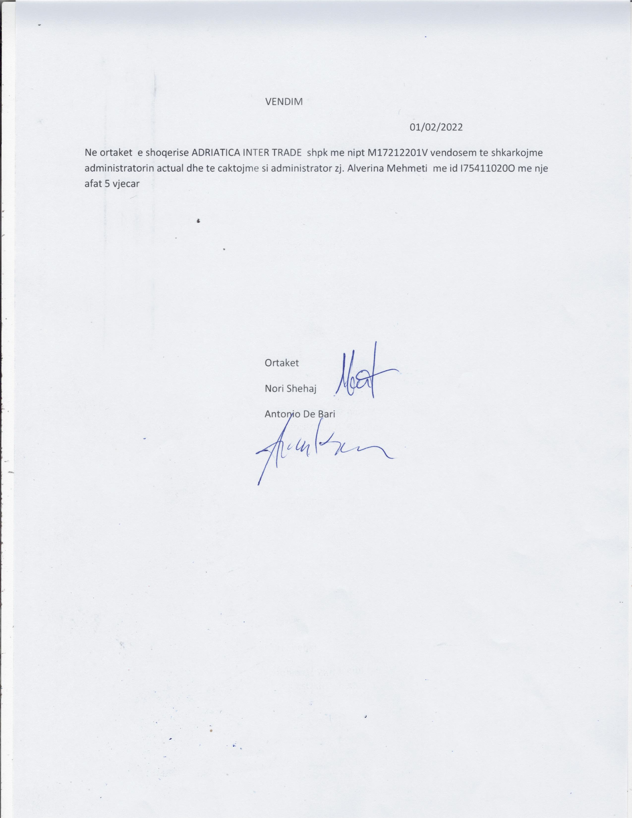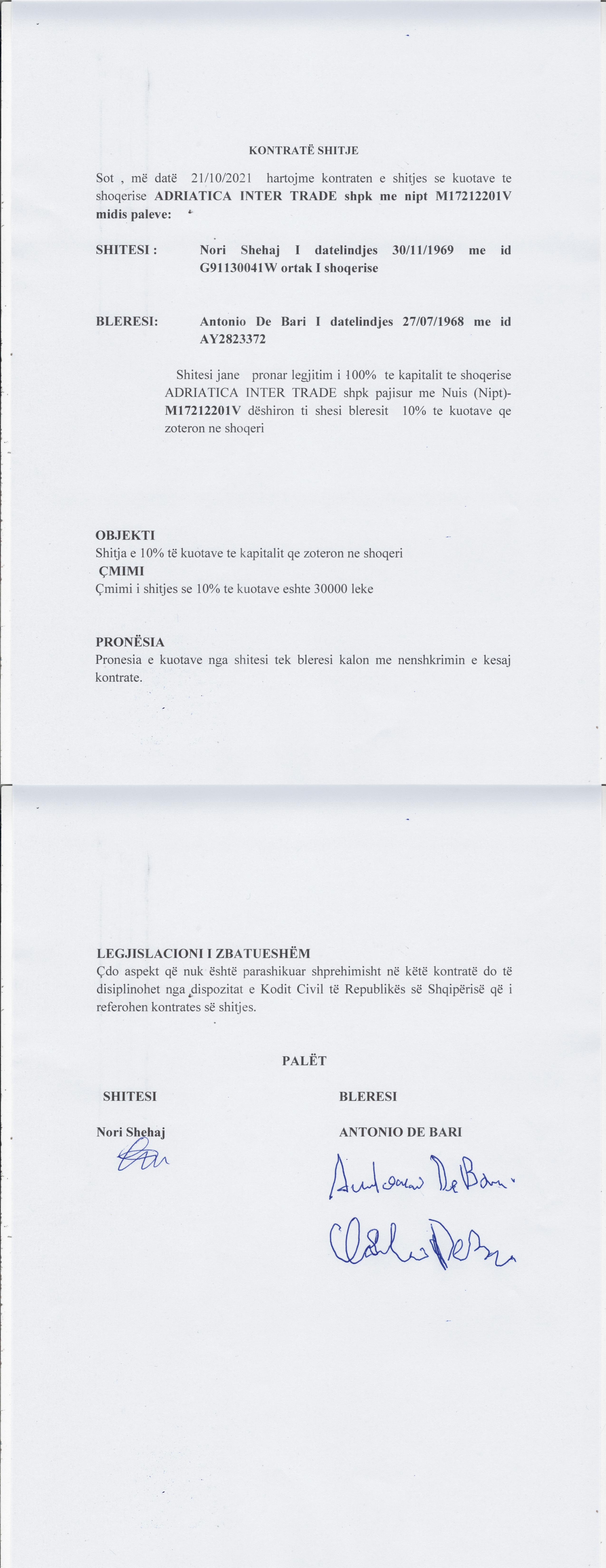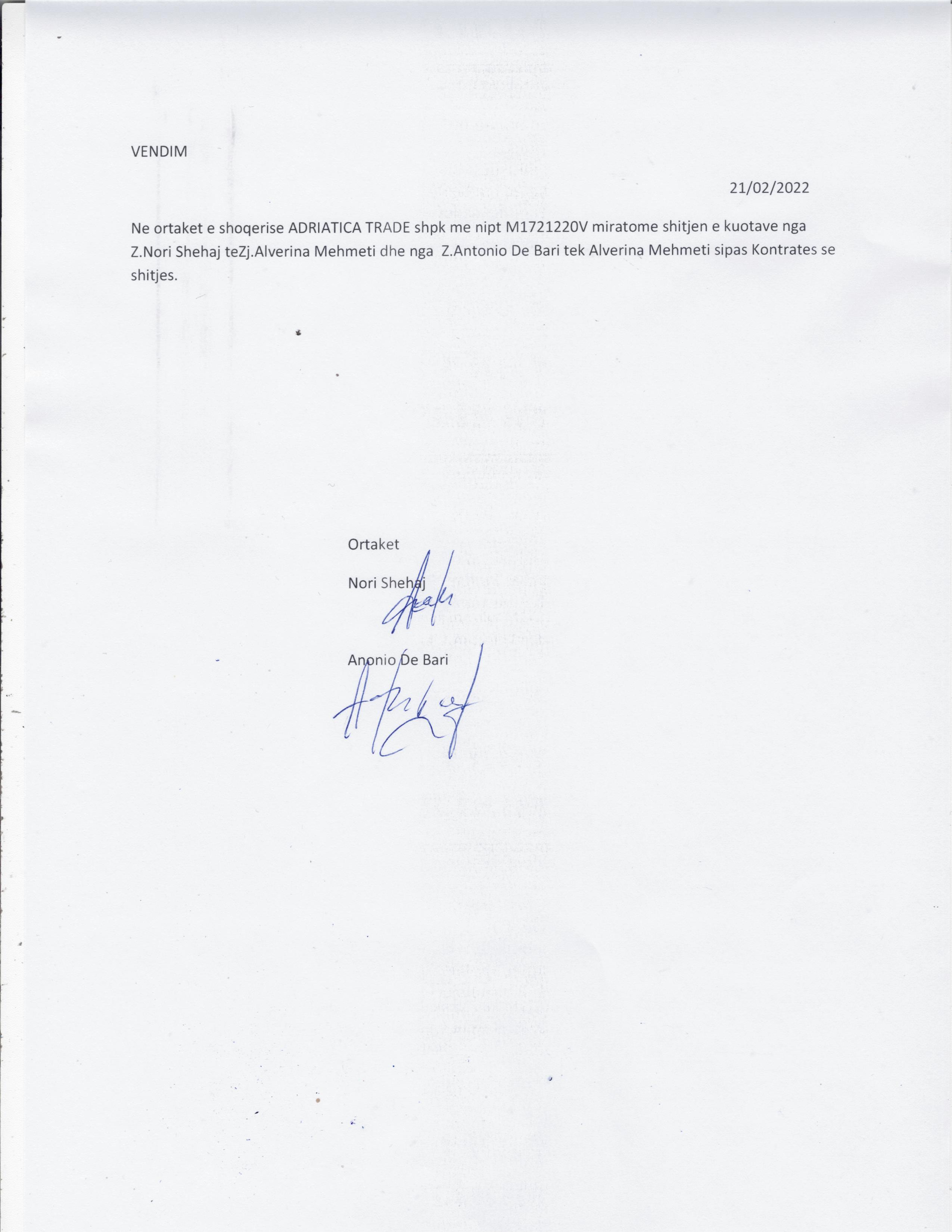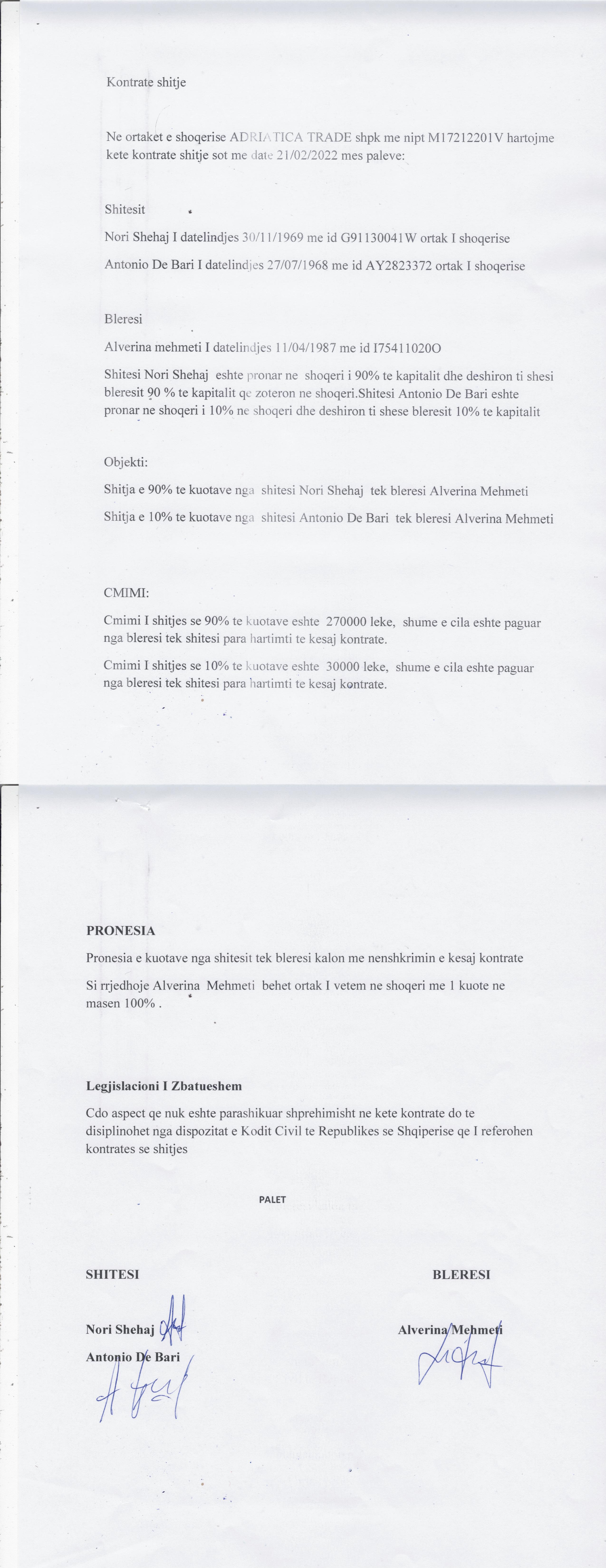 → Ekstrakti Historik i Regjistrit Tregtar date 03.03.2022 → Statuti i Shoqerise → Vendimi i asamblese se pergjithshme date 01.02.2022 → Kontrate e shitjes se kuotave date 21.10.2021 → Vendimi i asamblese se pergjithshme date 21.02.2022 → Kontrate shitje kuotash date 21.02.2022 |