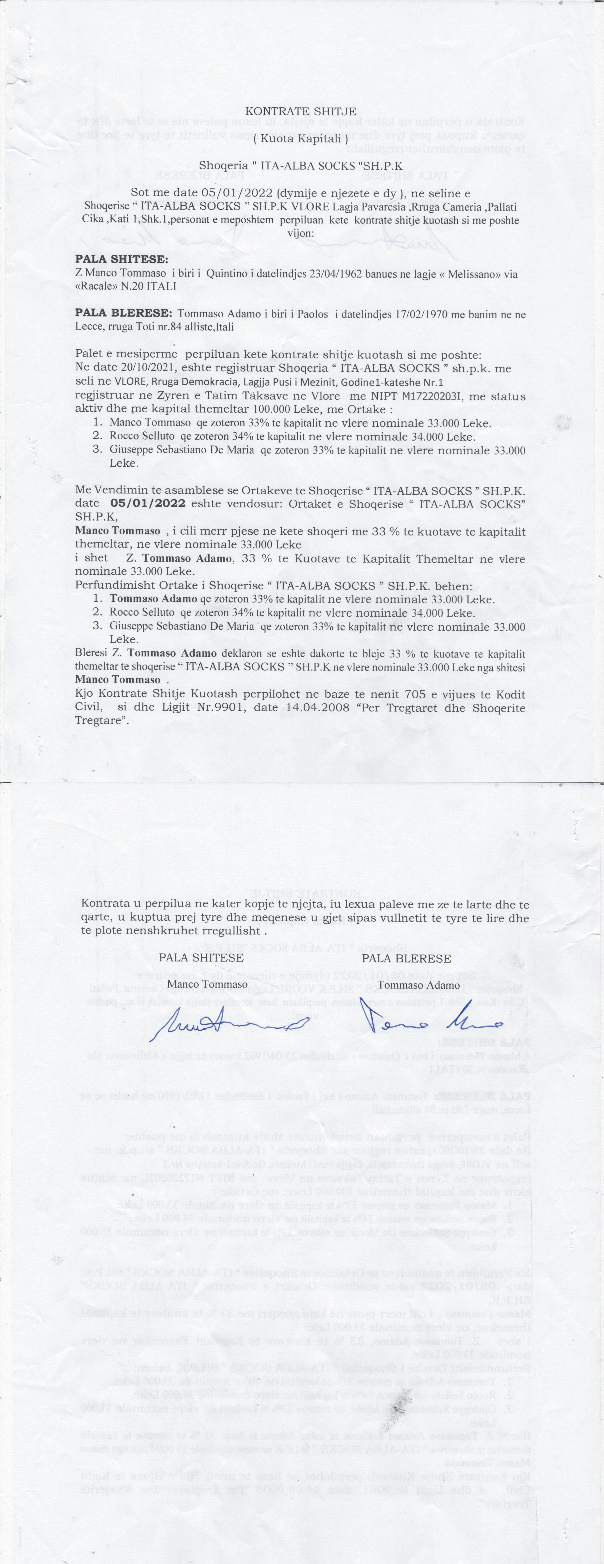 → Ekstrakti Historik i Regjistrit Tregtar date 07.03.2022 → Akt themelimi dhe Statuti i Shoqerise → Vendimi i asamblese se pergjithshme date 05.01.2022 → Kontrate shitje kuotash kapitali date 05.01.2022 |