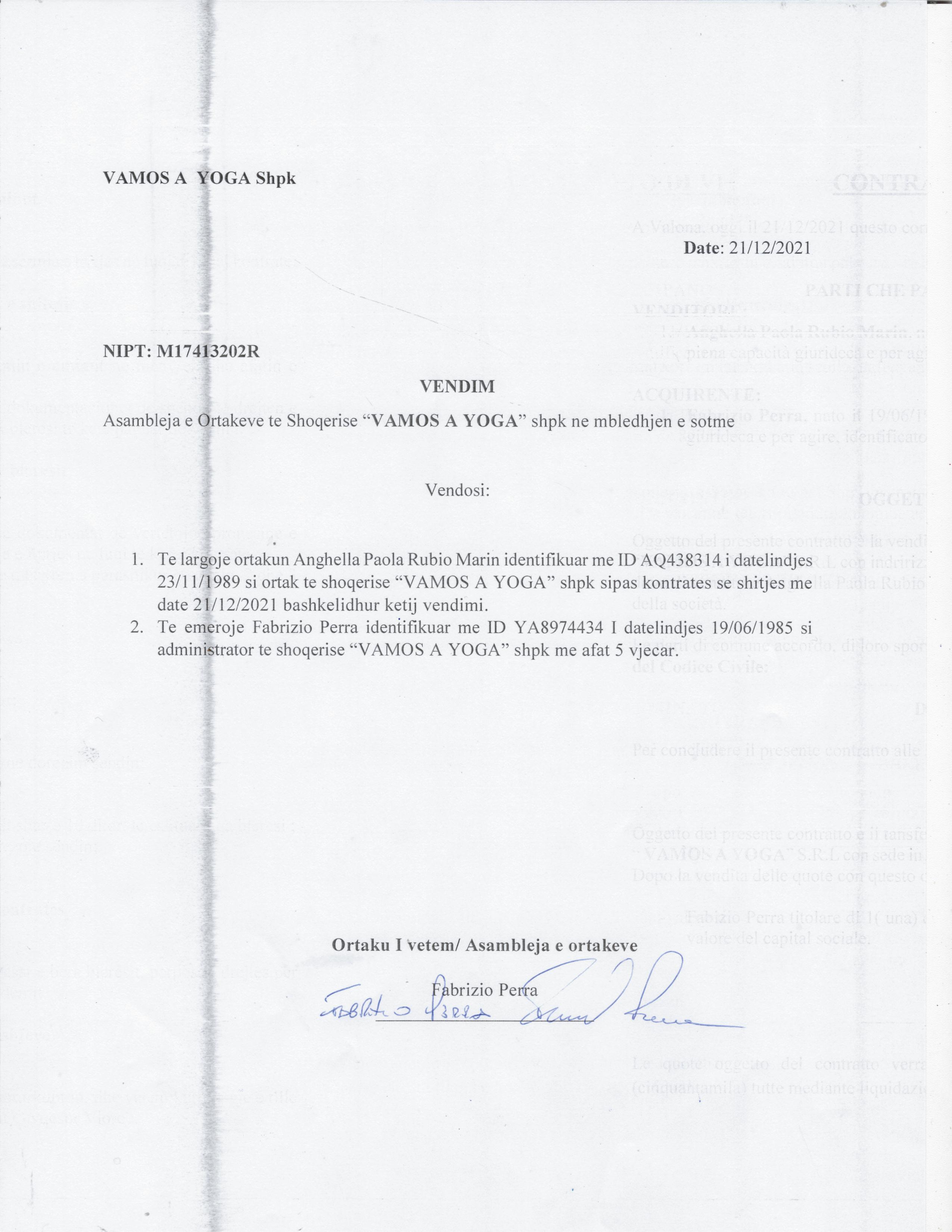 → Ekstrakti Historik i Regjistrit Tregtar date 18.03.2022 → Akt themelimi i Shoqerise → Vendimi i asamblese se pergjithshme date 21.12.2021 → Kontrate shitje kuote kapitali date 21.12.2021 |