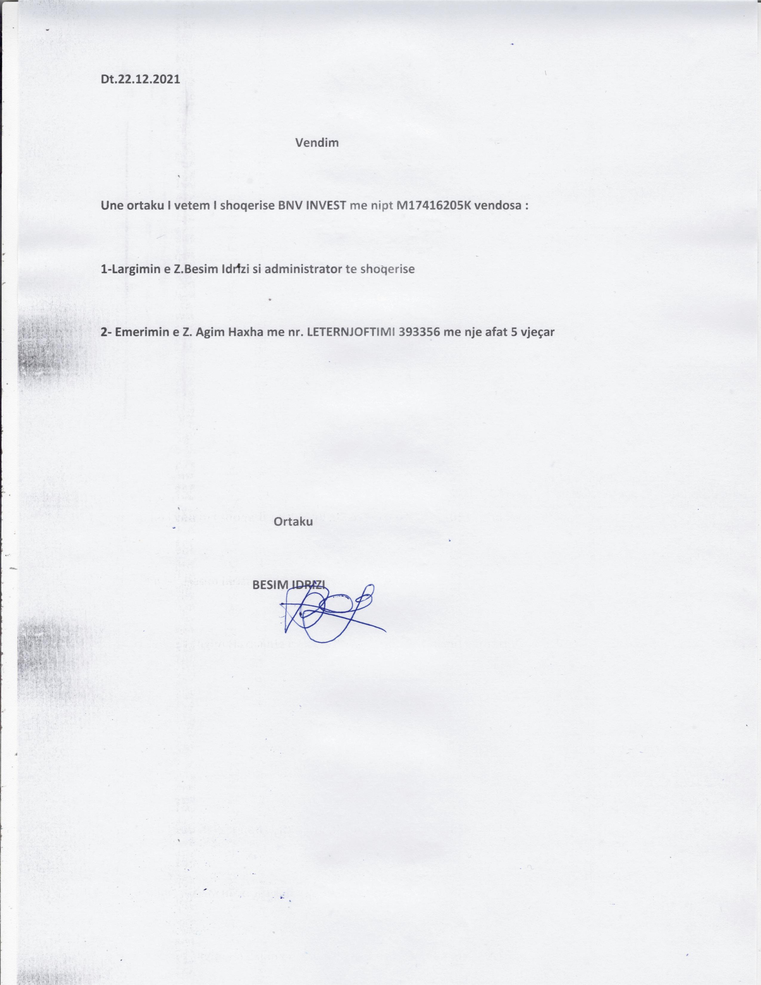 → Ekstrakti Historik i Regjistrit Tregtar date 18.03.2022 → Statuti i Shoqerise → Vendimi i asamblese se pergjithshme date 22.12.2021 |