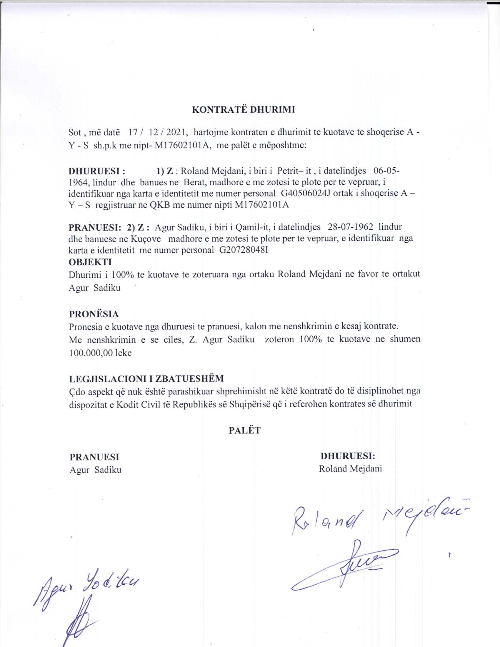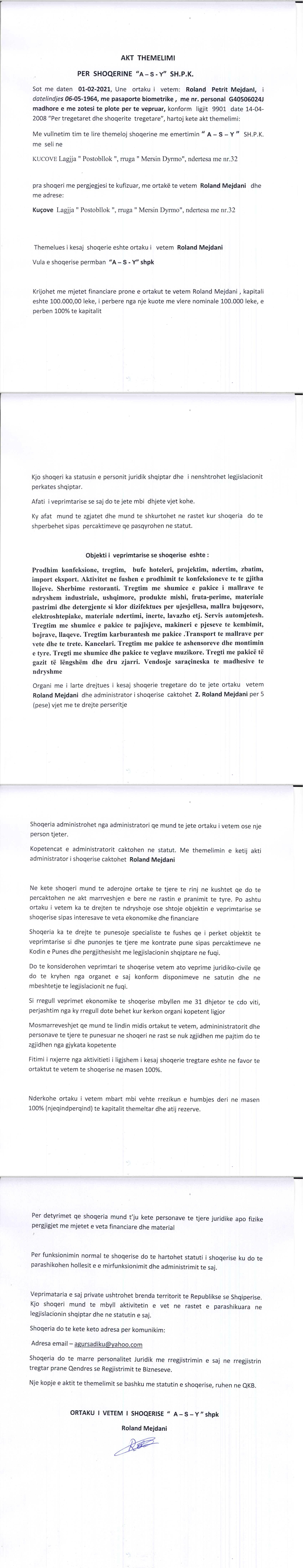 → Ekstrakt Historik i Regjistrit Tregtar date 20.09.2021 → Akt themelimi i Shoqerise → Kontrate Dhurimi Kuotash date 17.02.2021 → Ekstrakti Historik i Regjistrit Tregtar date 19.05.2023 |