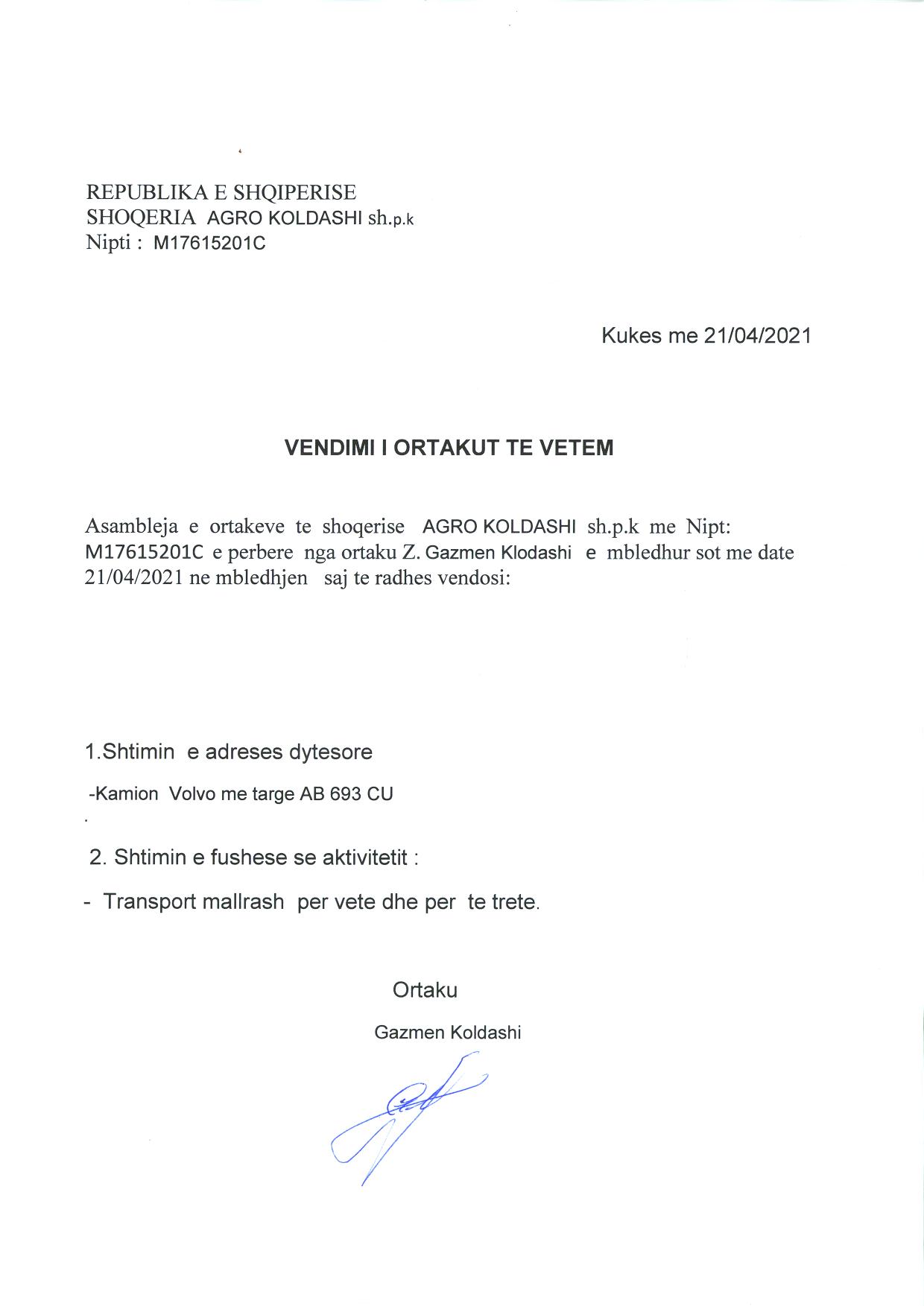 → Eksstrakt Historik i Regjistrit Tregtar, date 29/9/2021 → Akt themelimi i shoqerise, date 12.02.2021 → Statuti i shoqerise, date 12.02.2021 → Vendimi i ortakut te vetem , date 21.04.2021 |