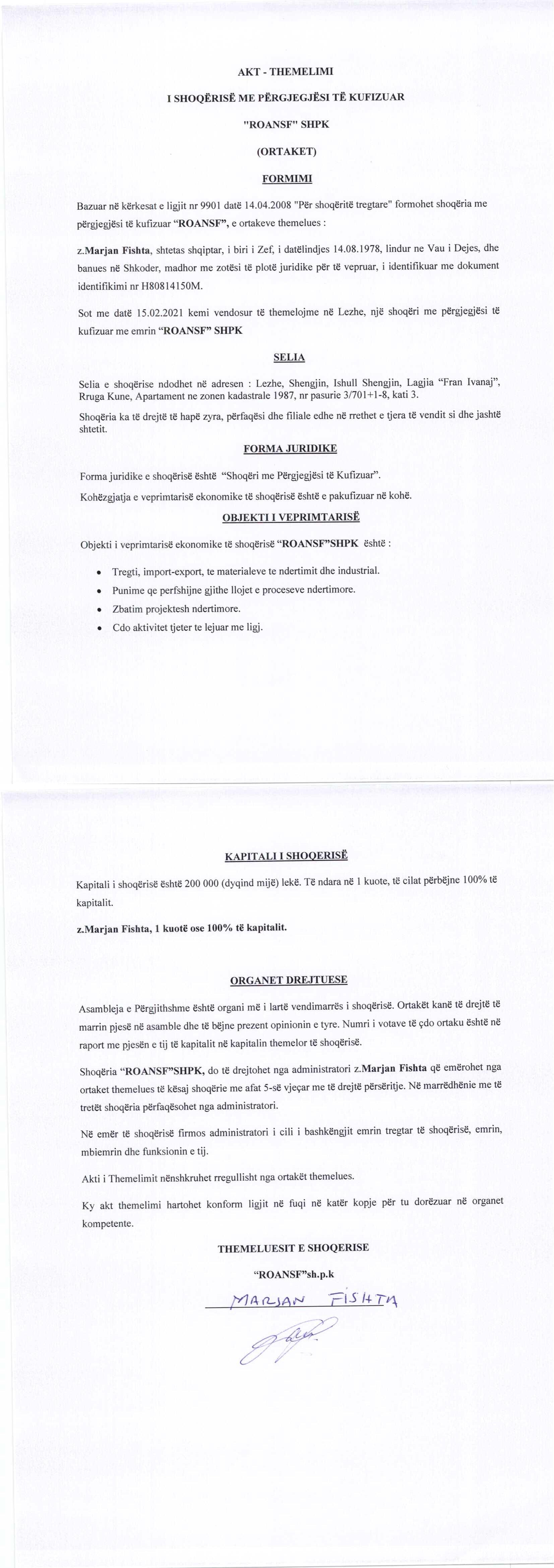 → Ekstrakt Historik i Regjistrit Tregtar, date 4/10/2021 → Statuti i themelimit, date 15.02.2021 → Akt themelimi, date 15.2.2021 |