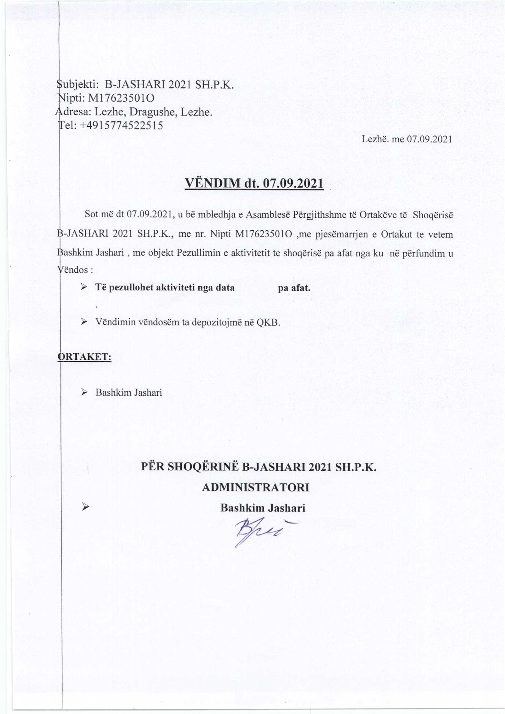 | Emërtime të tjera Tregtare: | B-JASHARI 2021 SH.P.K. |