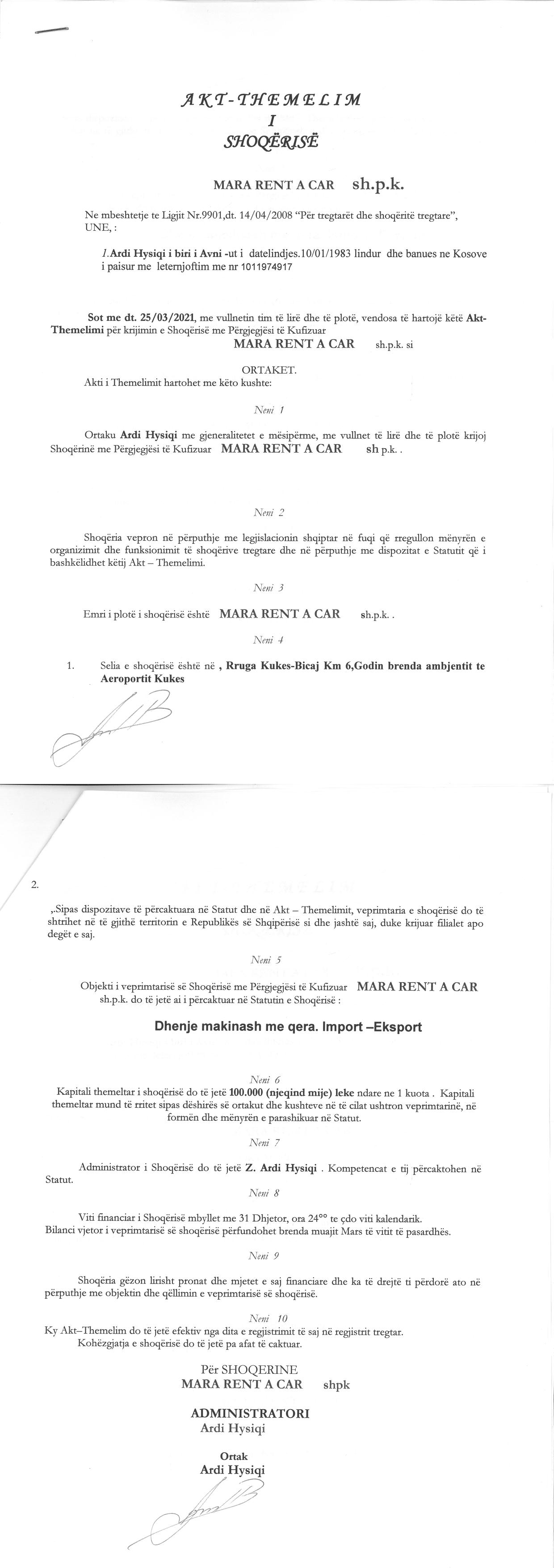 | Emërtime të tjera Tregtare: | MARA RENT A CAR |