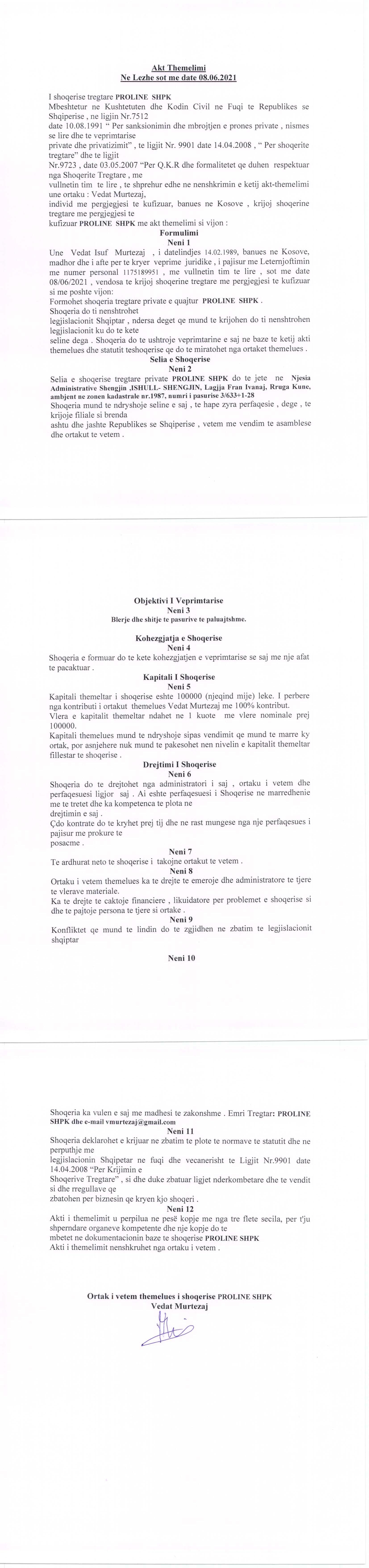 → Ekstrakt Historik I Regjistrit Tregtar, date 31.01.2022 → Akt themelimi, date 08.06.2021 → Statuti i shoqerise, date 08.06.2021 |