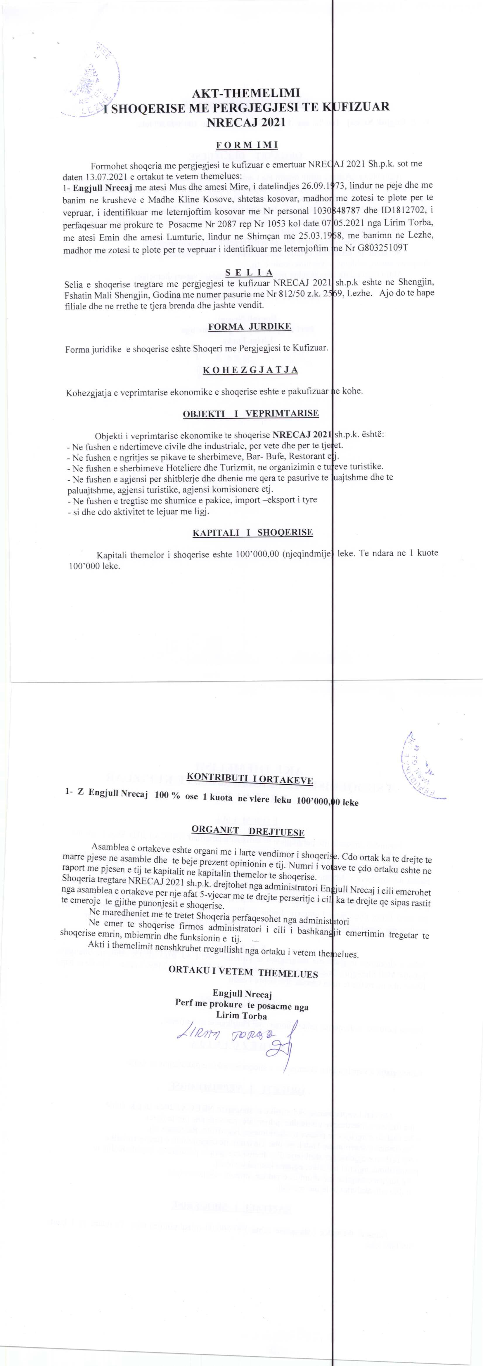→ Ekstrakt Historik i Regjistrit Tregtar, date 14.02.2022 → Akt themelimi, date 13.07.2021 → Statuti i shoqerise, date 13.07.2021 |