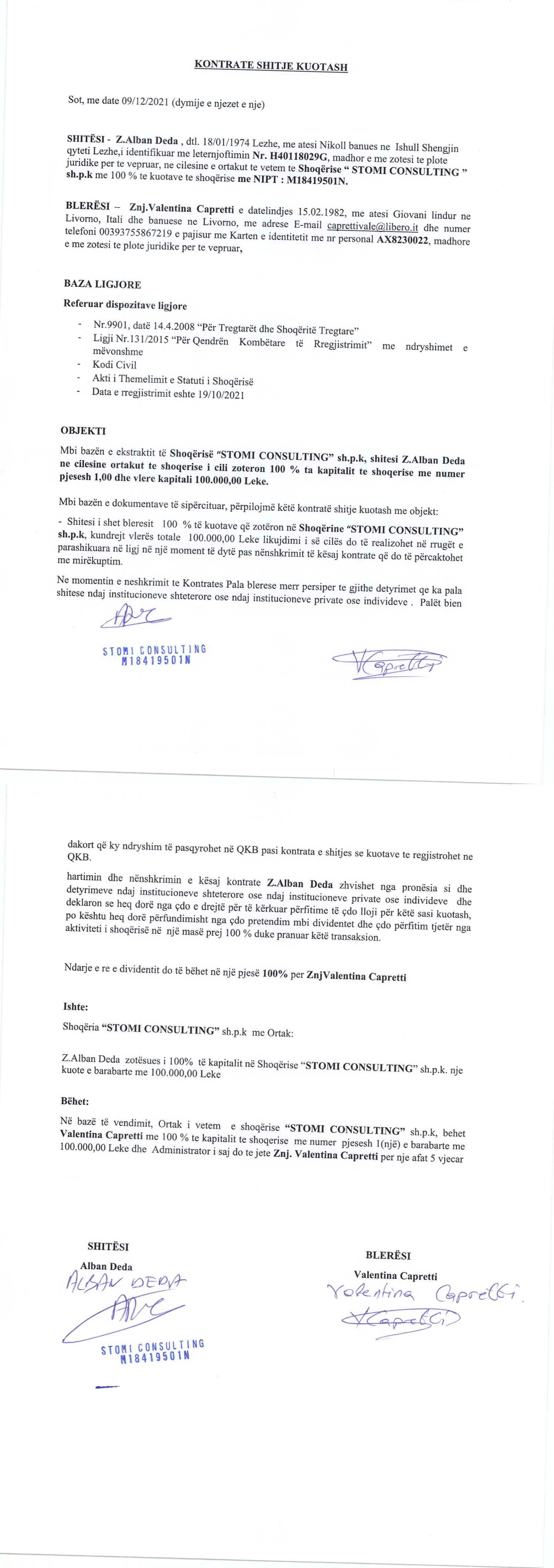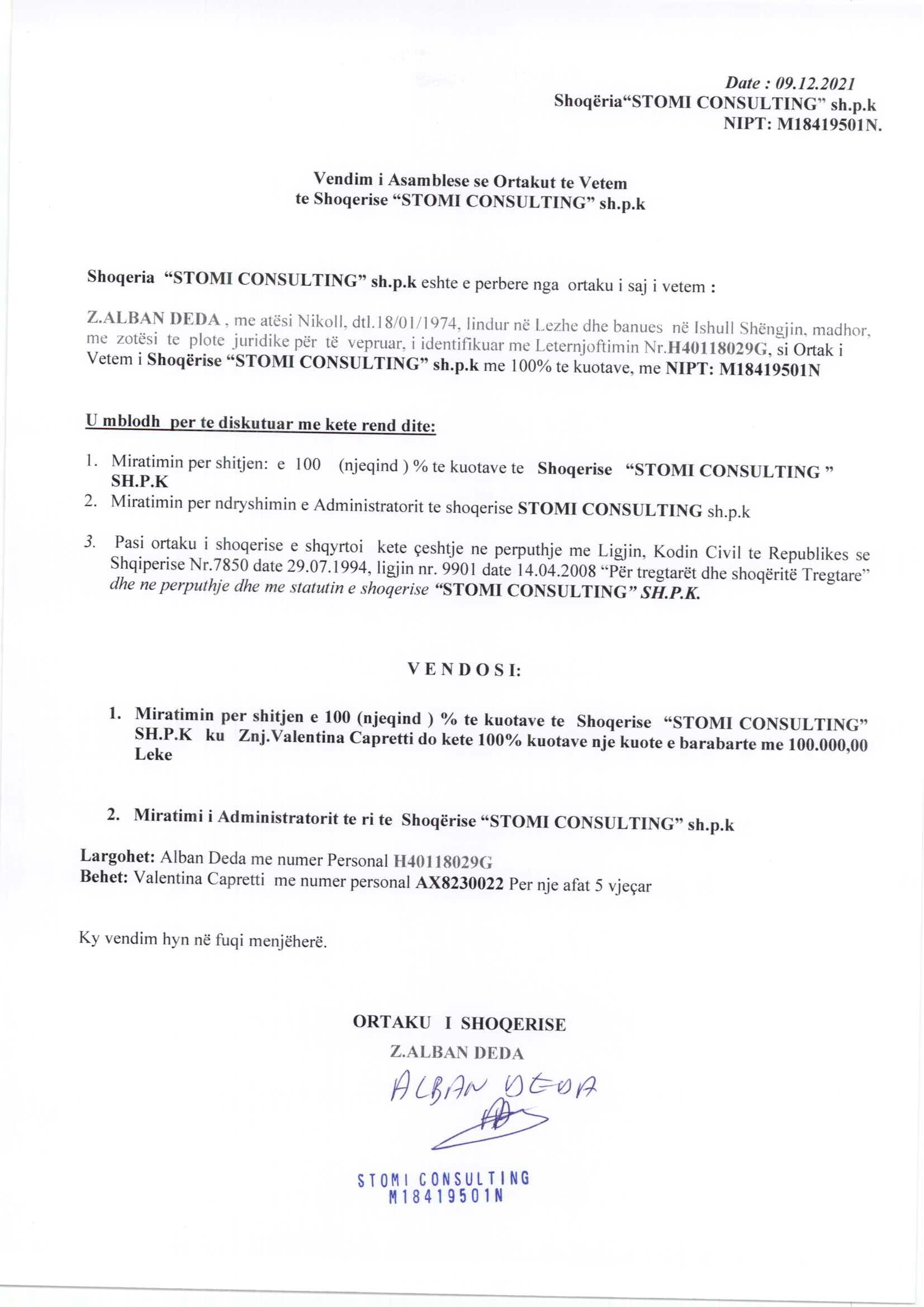→ Ekstrakti Historik i Regjistrit Tregtar date 07.03.2022 → Akt themelimi dhe Statuti i Shoqerise → Vendimi i asamblese se pergjithshme date 09.12.2021 → Kontrate shitje te kuotave date 09.12.2021 |