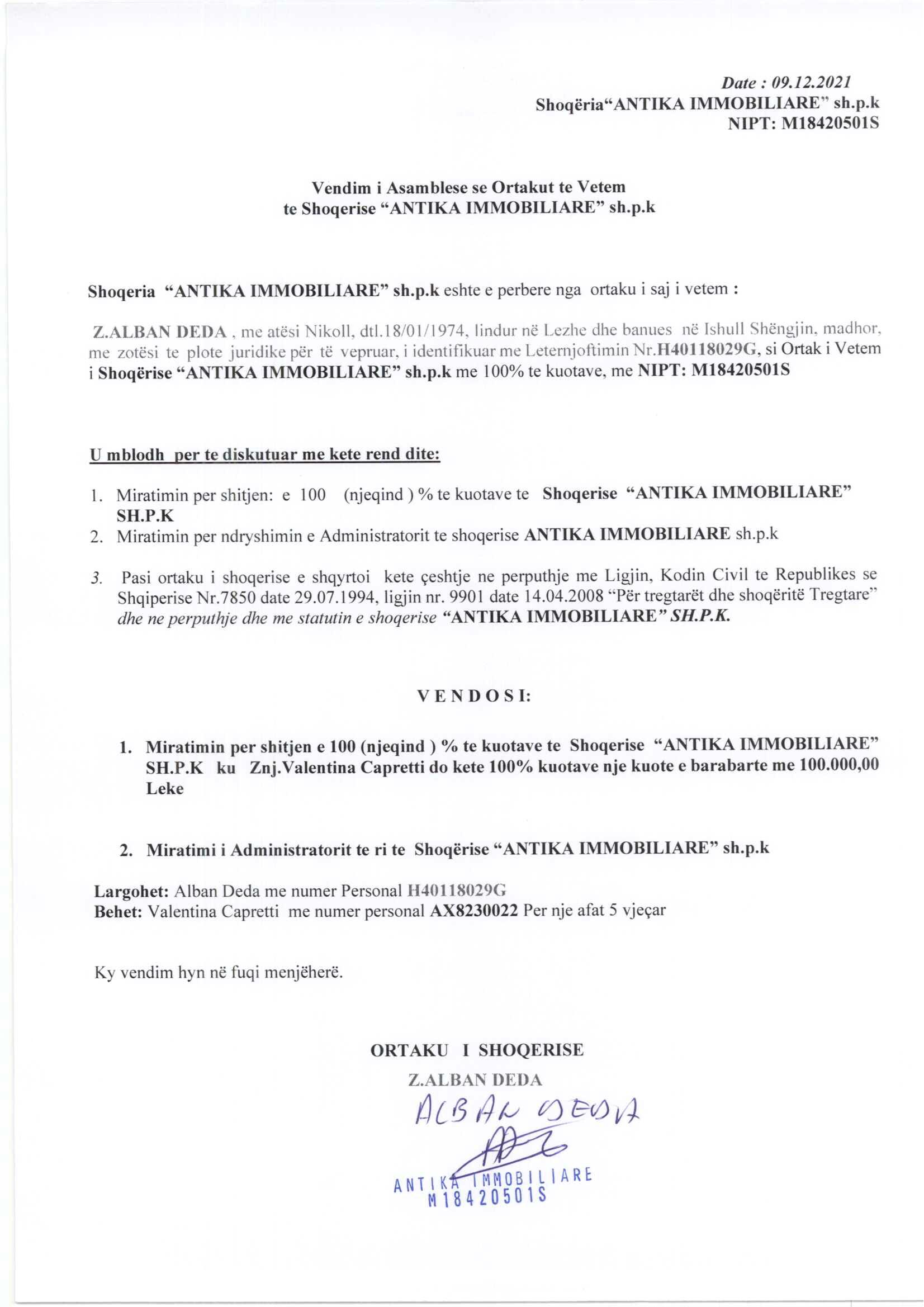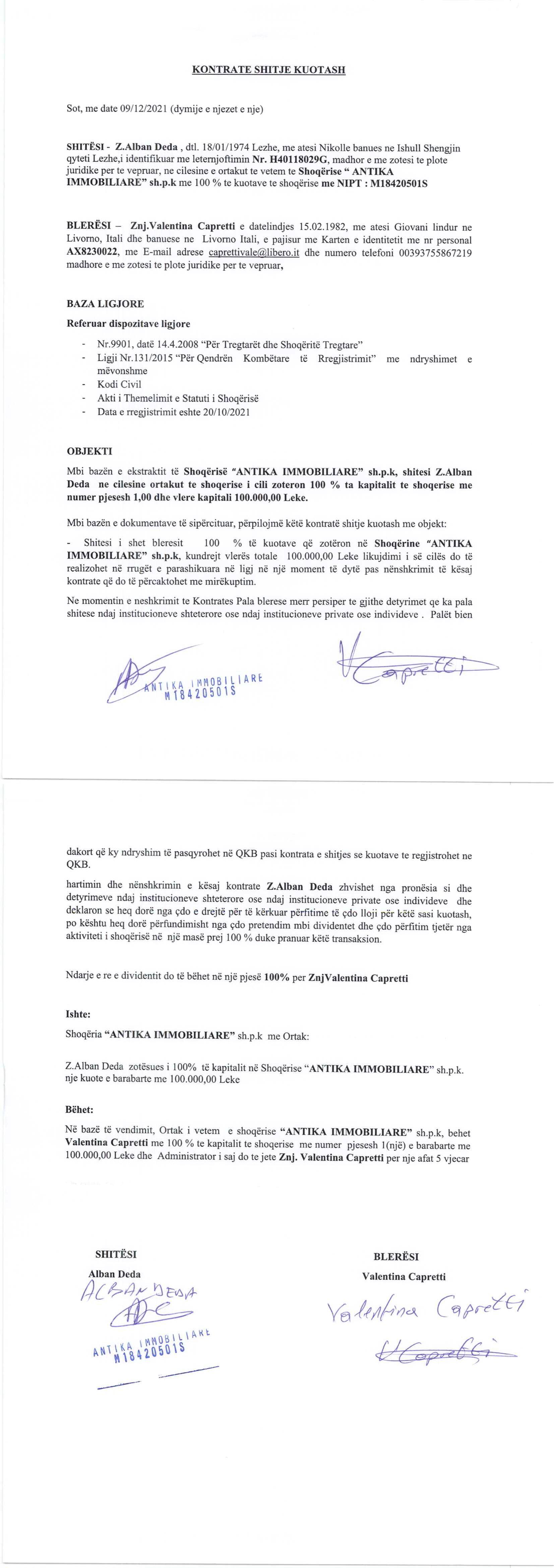 → Ekstrakti Historik i Regjistrit Tregtar date 07.03.2022 → Akt themelimi dhe Statuti i Shoqerise → Vendimi i asamblese se pergjithshme date 09.12.2021 → Kontrate shitje te kuotave date 09.12.2021 |