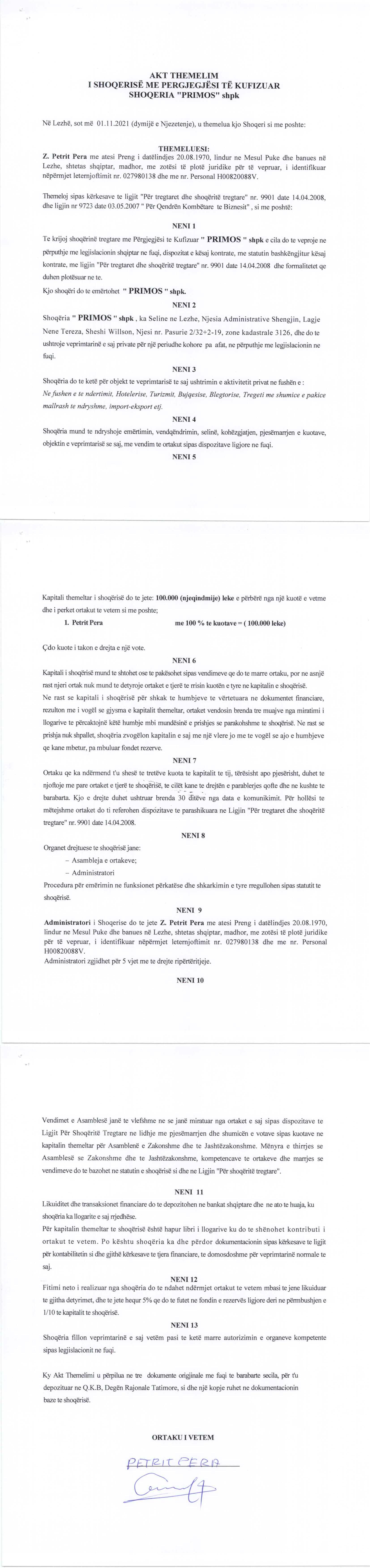 | Emërtime të tjera Tregtare: | " PRIMOS" shpk |