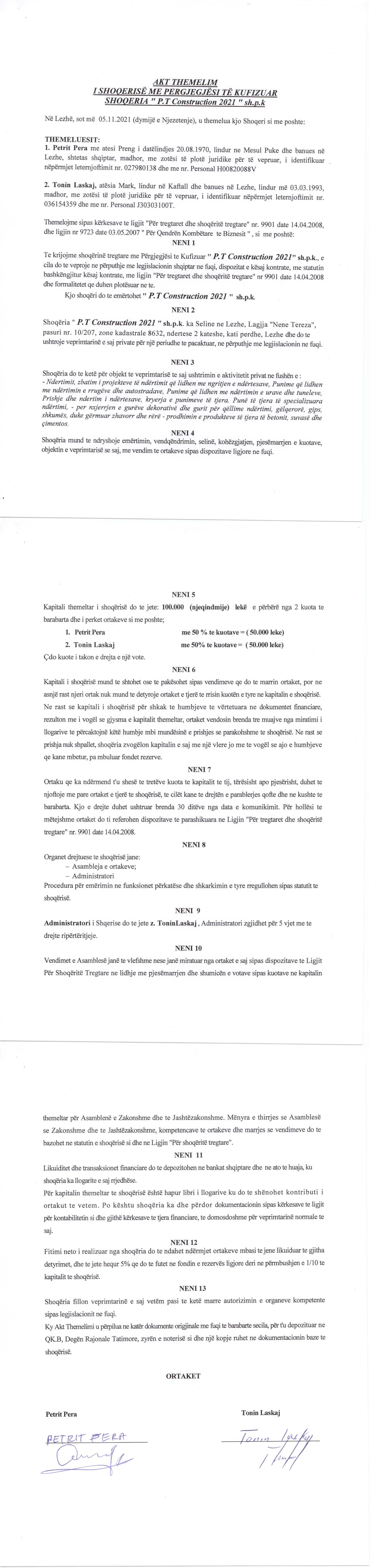 | Emërtime të tjera Tregtare: | "P.T Construction 2021" Sh.p.k |