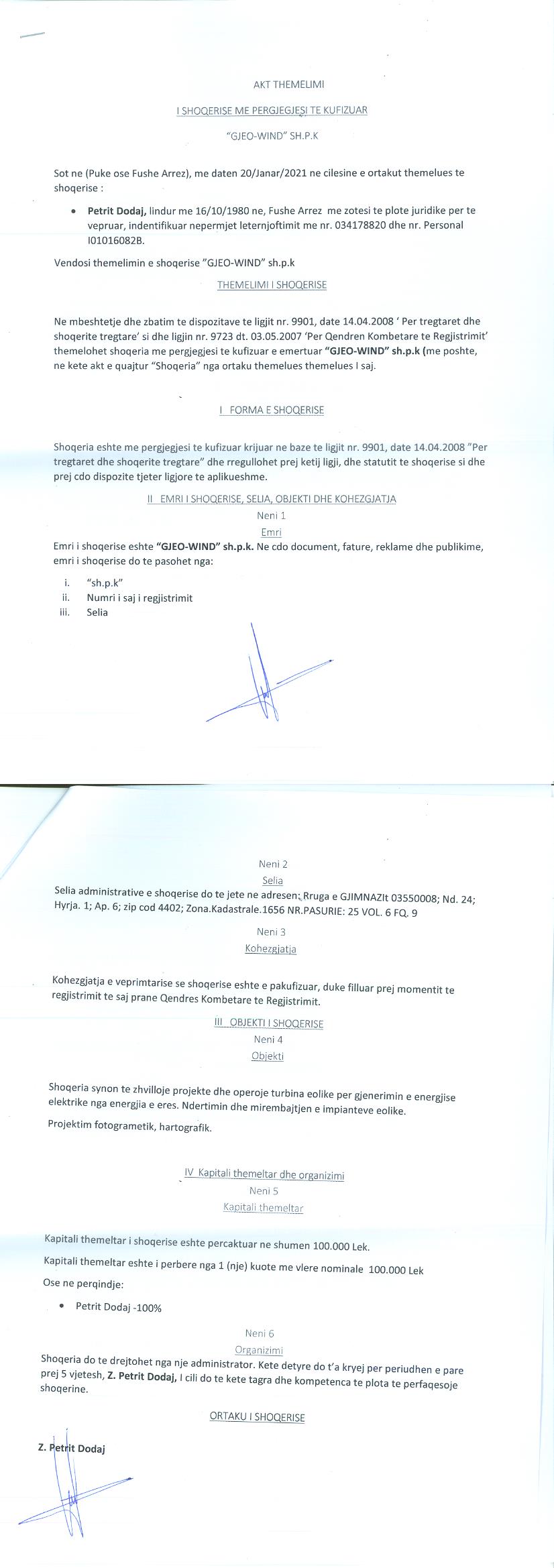 | Objekti i Veprimtarisë: | Shoqeria synon te zhvilloje projekte dhe operoje turbina eolike per gjenerimin e energjise elektrike nga energjia e eres. Ndertimin dhe mirembajtjen e impianteve eolike.Projektim fotogrametik, hartografik |