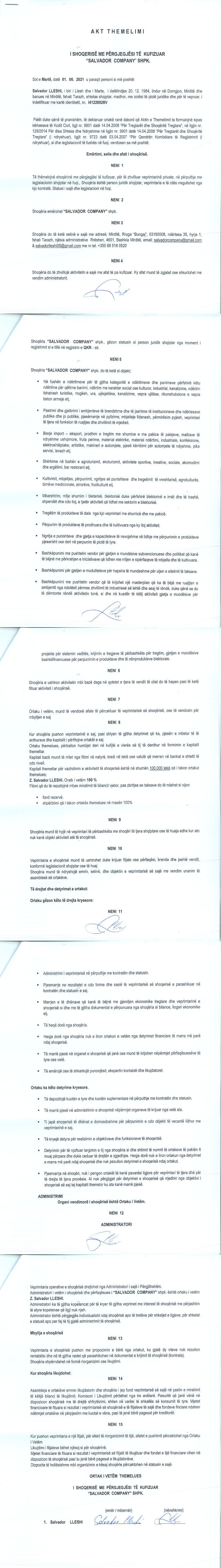 → Ekstrakt Historik I Regjistrit Tregtar, date 28.01.2022 → Akt themelimi, date 01.06.2021 → Statuti i shoqerise, date 01.06.2021 |