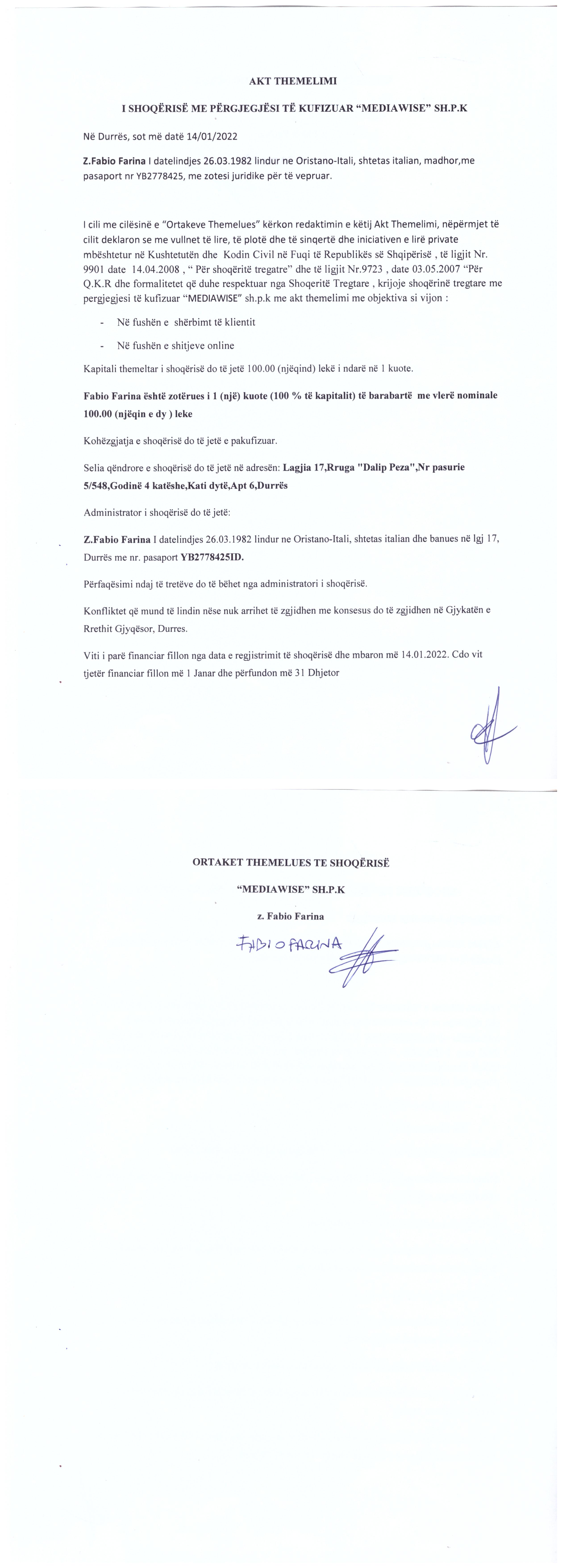 → Ekstrakti Historik i Regjistrit Tregtar date 10.02.2022 → Akt themelimi i Shoqerise |
