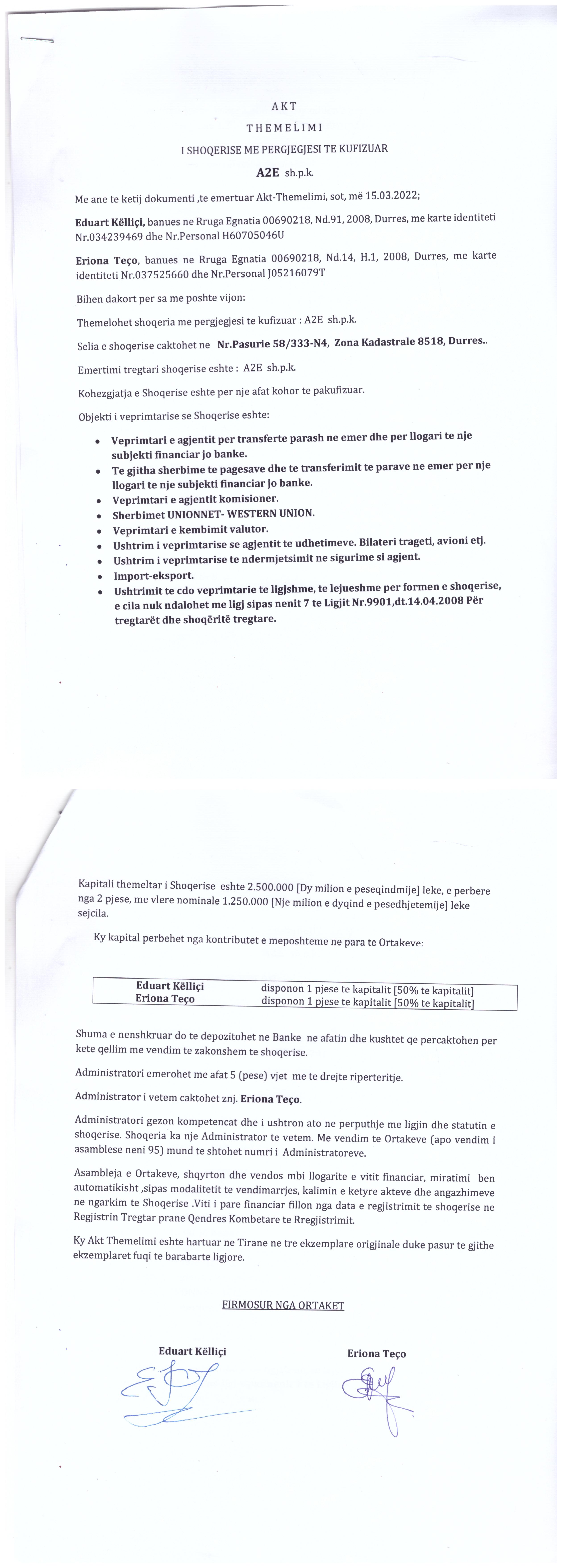 | Kapitali Themeltar(Lekë): | 2 500 000,00 |