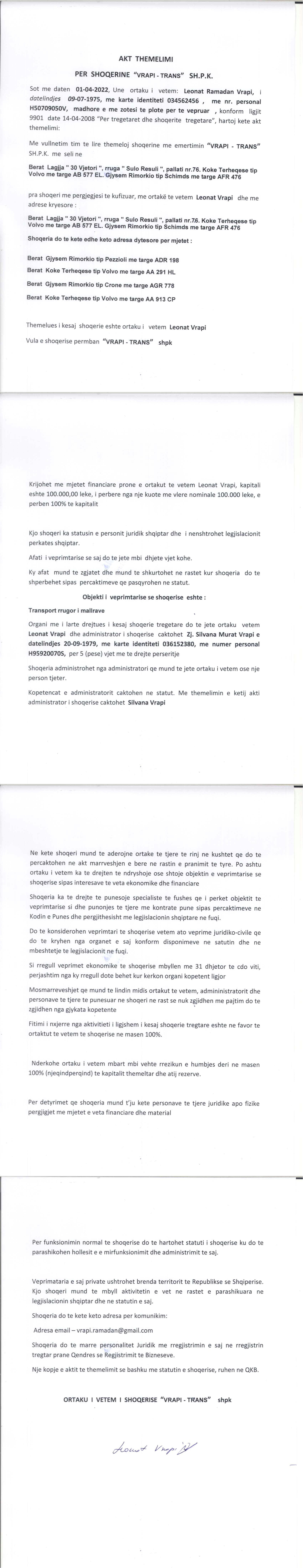 | Mjete të ushtrimit të aktivitetit: | I. Berat Koke Terheqese tip Volvo me targe AA 913 CP II. Berat Gjysem Rimorkio tip Pezzioli me targe ADR 198 III. Berat Koke Terheqese tip Volvo me targe AA 291 HL IV. Berat Gjysem Rimorkio tip Crone me targe AGR 778 |